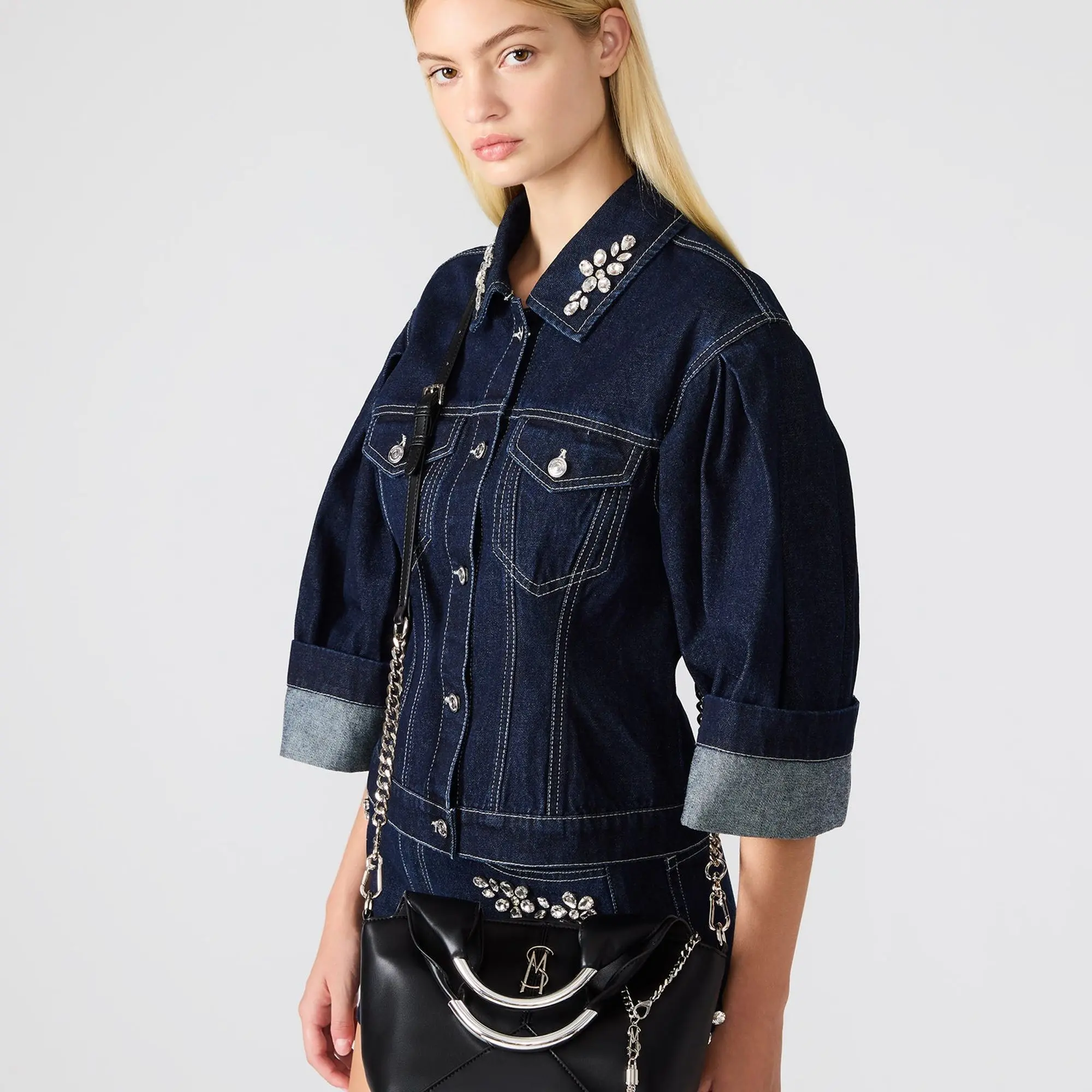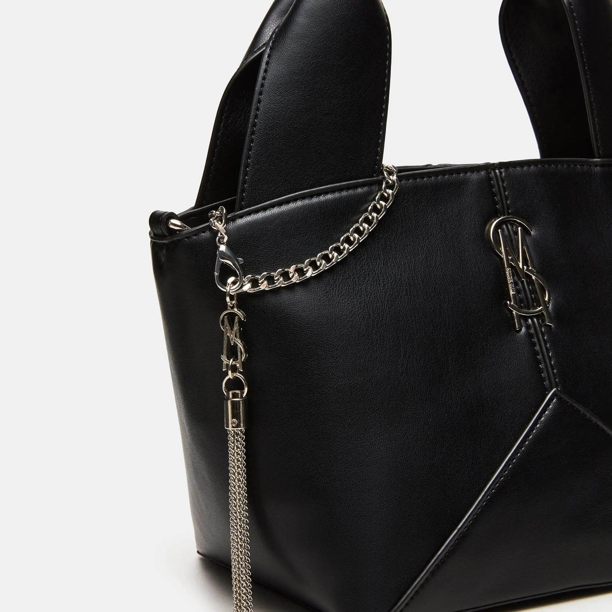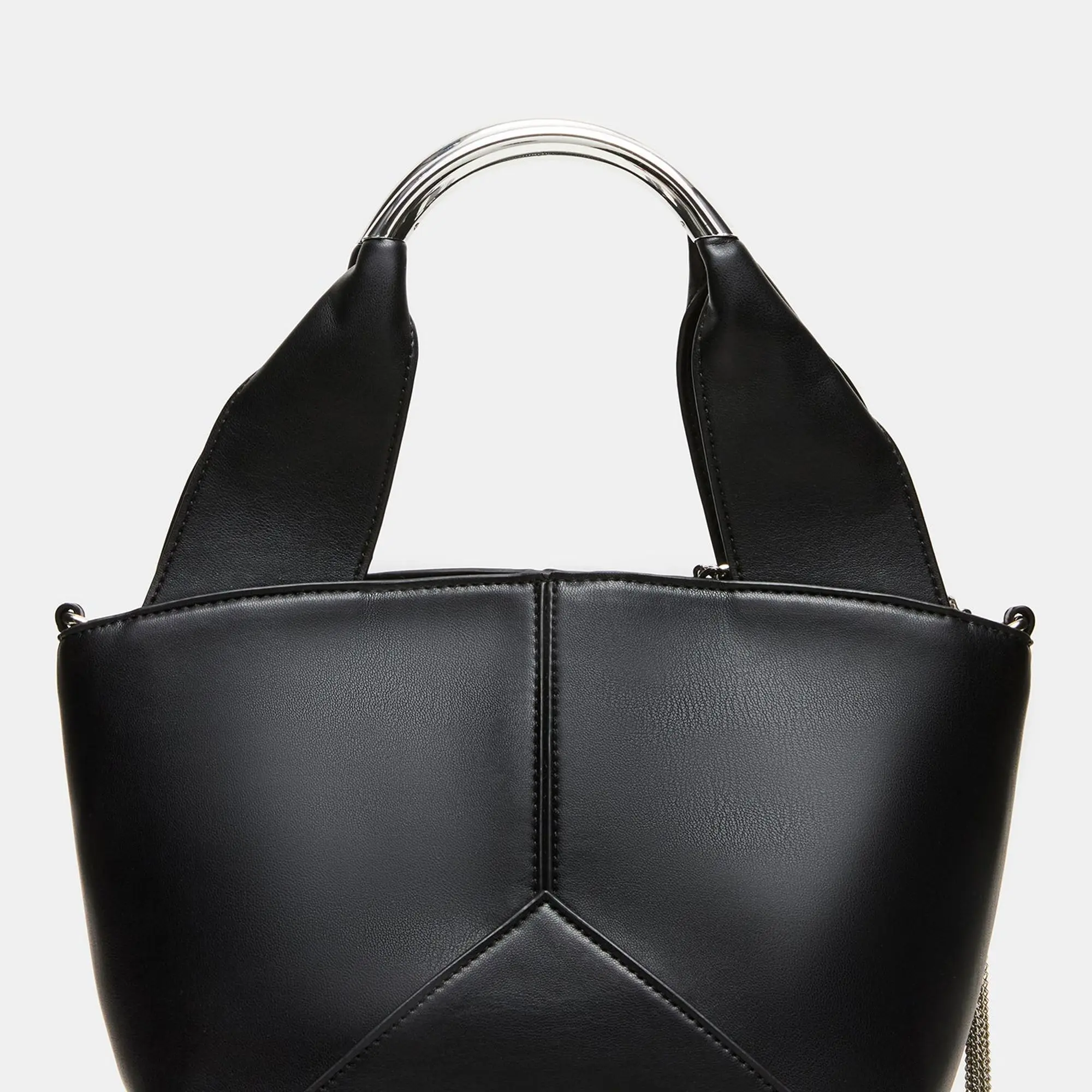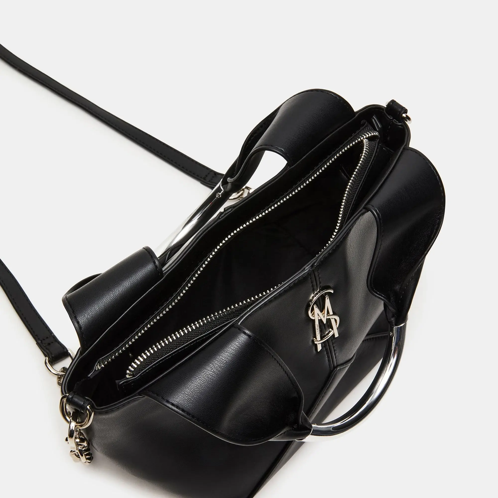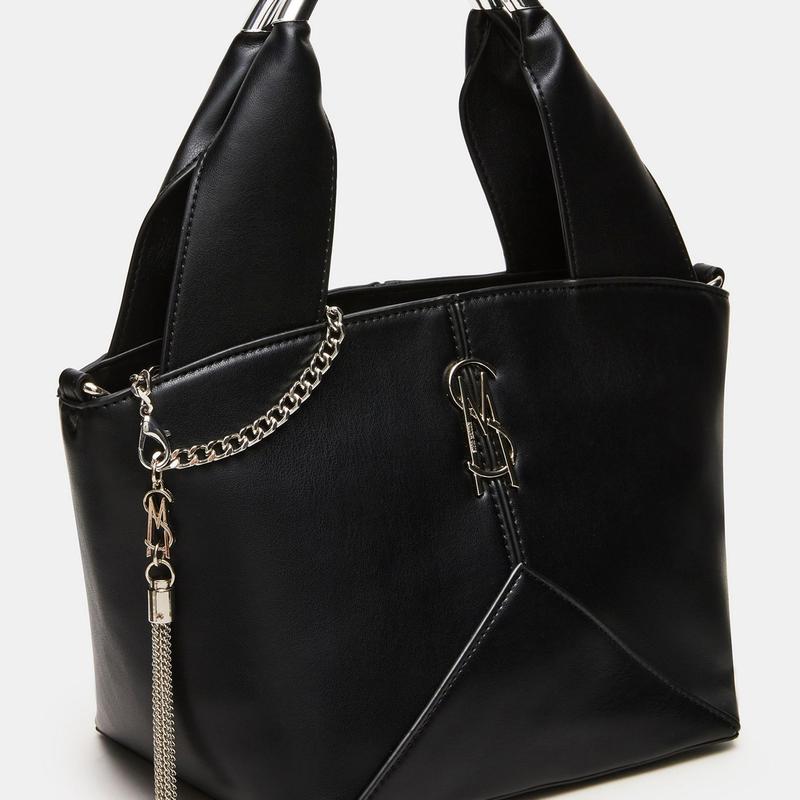 The VIV BAG BLACK/SILVER offers versatile style with its top-handle design and detachable, adjustable crossbody strap for hands-free convenience. Featuring unique hardware handles and statement hardware details, it adds sophistication. Detachable bag and tassel charms enhance its refined look, allowing for customization to match your personal style. Perfectly blending practicality with distinctive design, this bag is an expert choice for those seeking both function and flair.