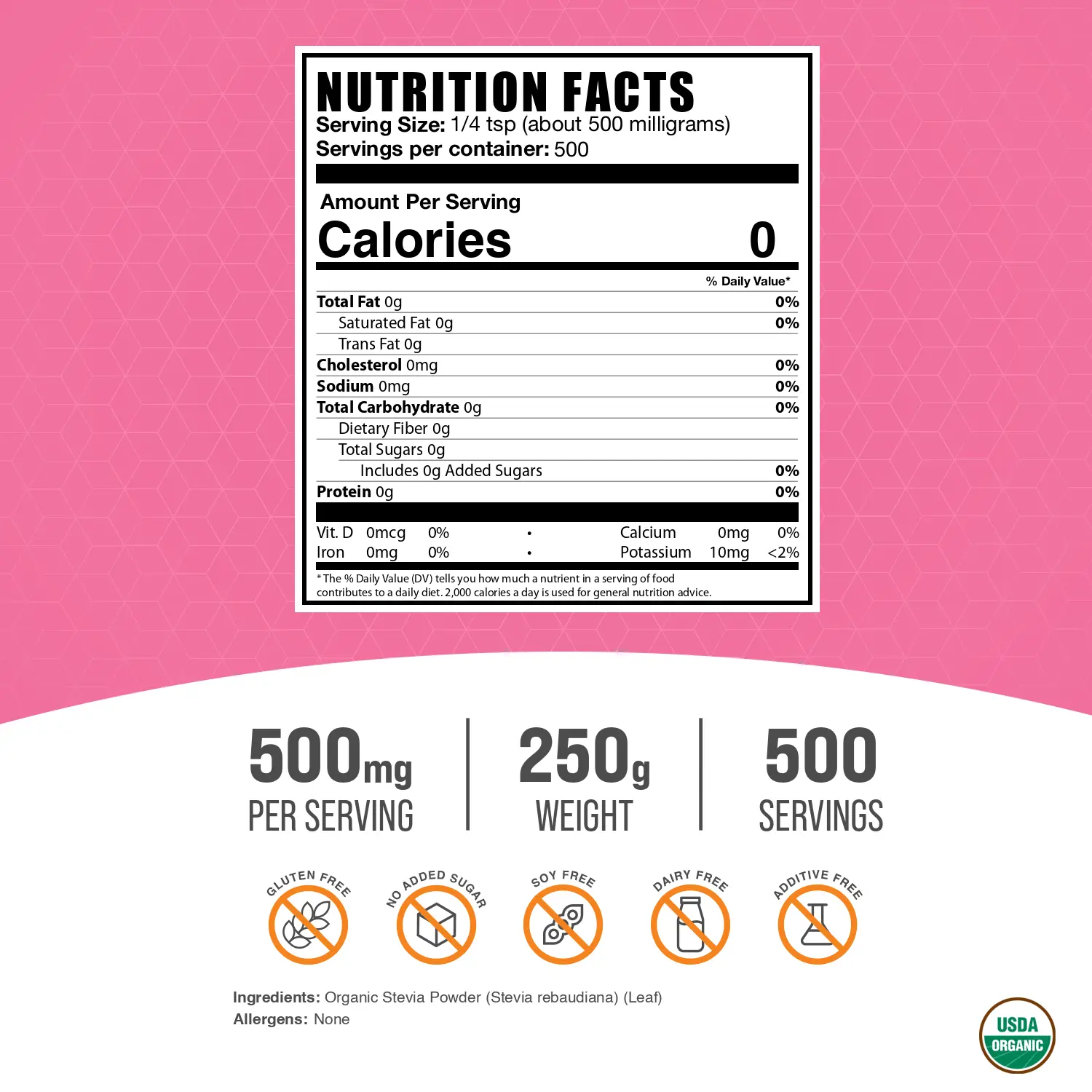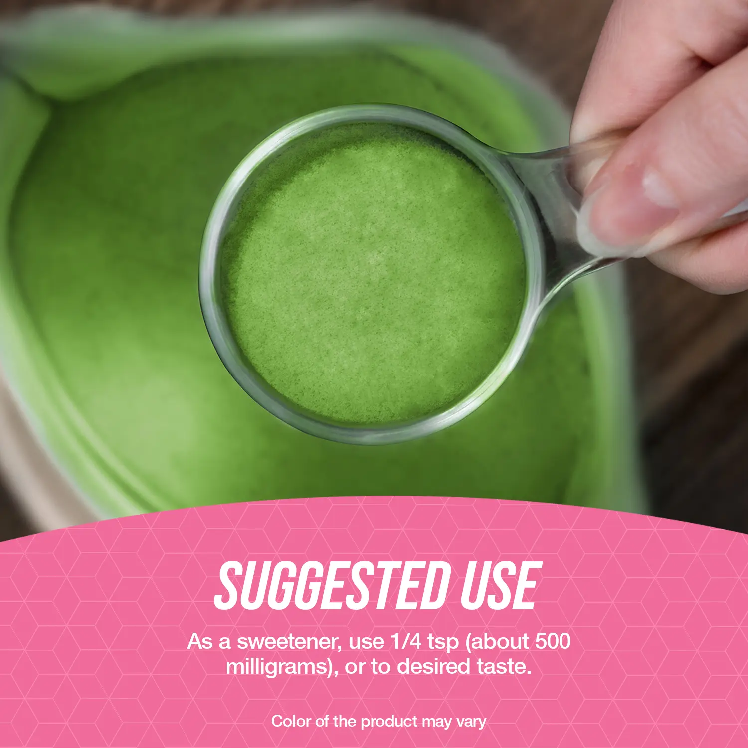 Suggested Use: As a sweetener, use 1/4 tsp (about 500 milligrams), or to desired taste.