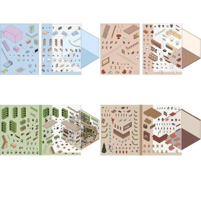 Sticker Therapy Isometric Room Stickers Book 3D House Scene Stickers 4 Sets DIY Scene Sticker Your Own, Cute Korean Cartoon,Fun Stacking for Adult Kids,Ship From China