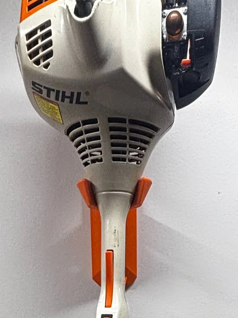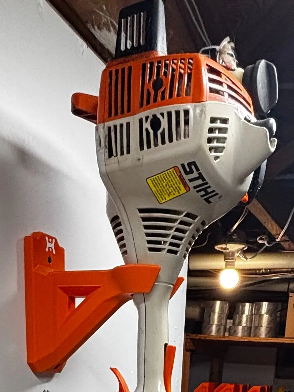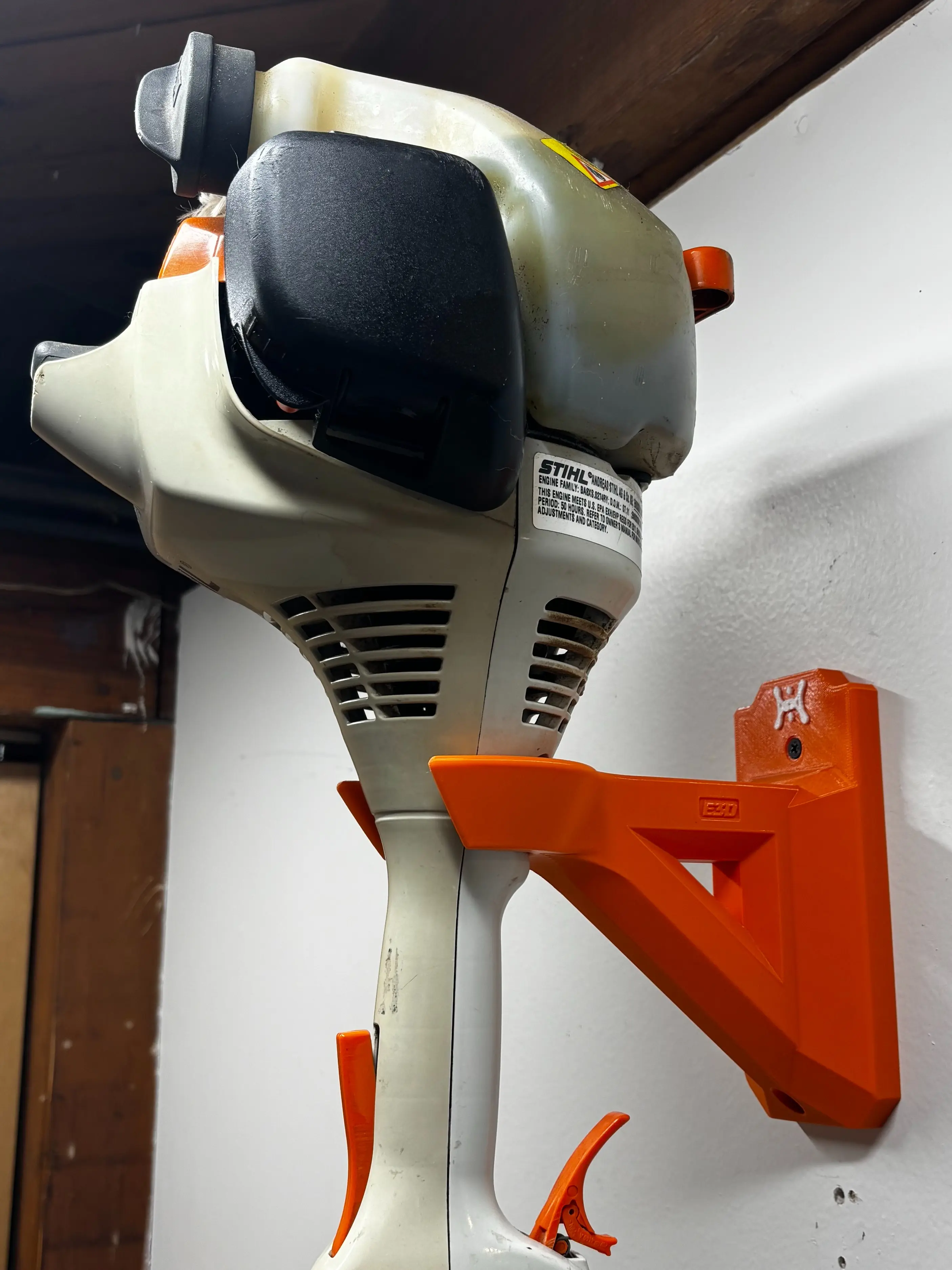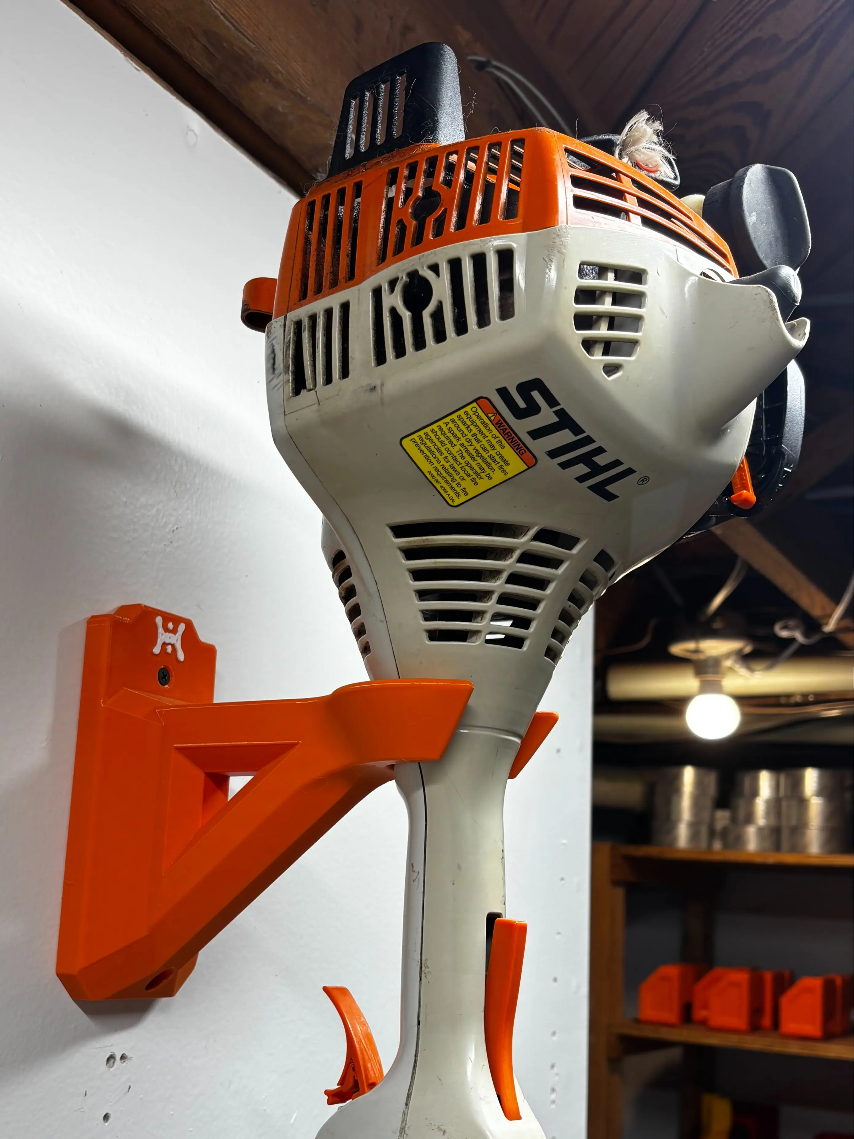 Hang up your Weed Eater for convenience. Going to be compatible with most STIHL String Trimmers that have a tapered motor housing, but the ones in the photos are the FS 55 R and the FS 74. Has chamfered holes for wall mounting with standard drywall screws. The opening is 1.8" wide as seen in the CAD photo, use this measurement to determine if your model of String Trimmer will fit.