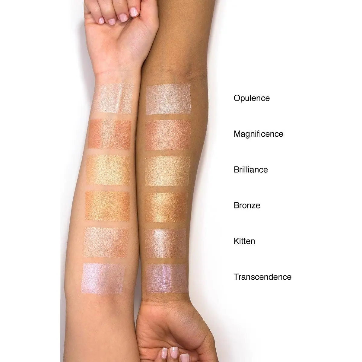 This highlight is less glittery and somewhat translucent, I feel like I have to apply multiple coats to see any shine. First pic is with one coat; very subtle. Second with about 3 coats and this is on textured skin. Product is very soft and almost like a cream texture.