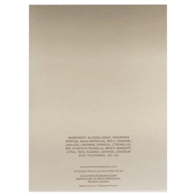 Launched by the design house of Jennifer Lopez in the year 2003. This floral fragrance has a blend of white pepper, mandarine, earl grey tea, fresia, rose, jasmine, orange blossom, lily of the valley, sandalwood, musk, amber, orris, and pepper.