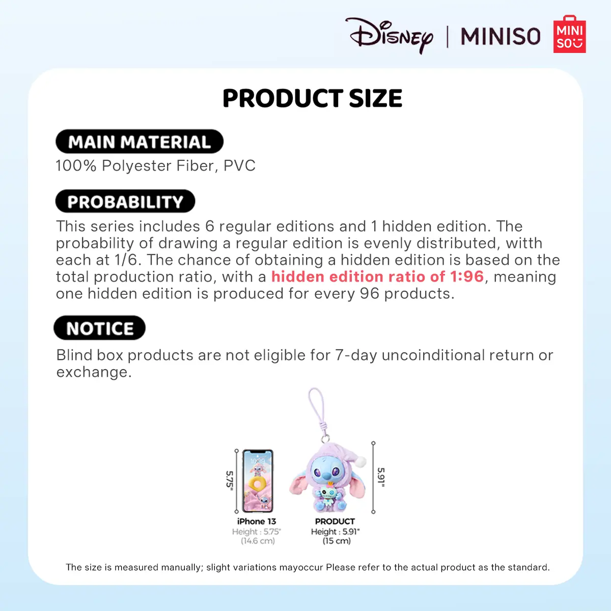 ·Convenient Keychain AttachmentEquipped with a sturdy keychain hook, it's easy to attach and remove from various items. You can quickly transfer it from one bag to another or use it to keep your keys organized while adding a touch of Disney magic to your keyring.