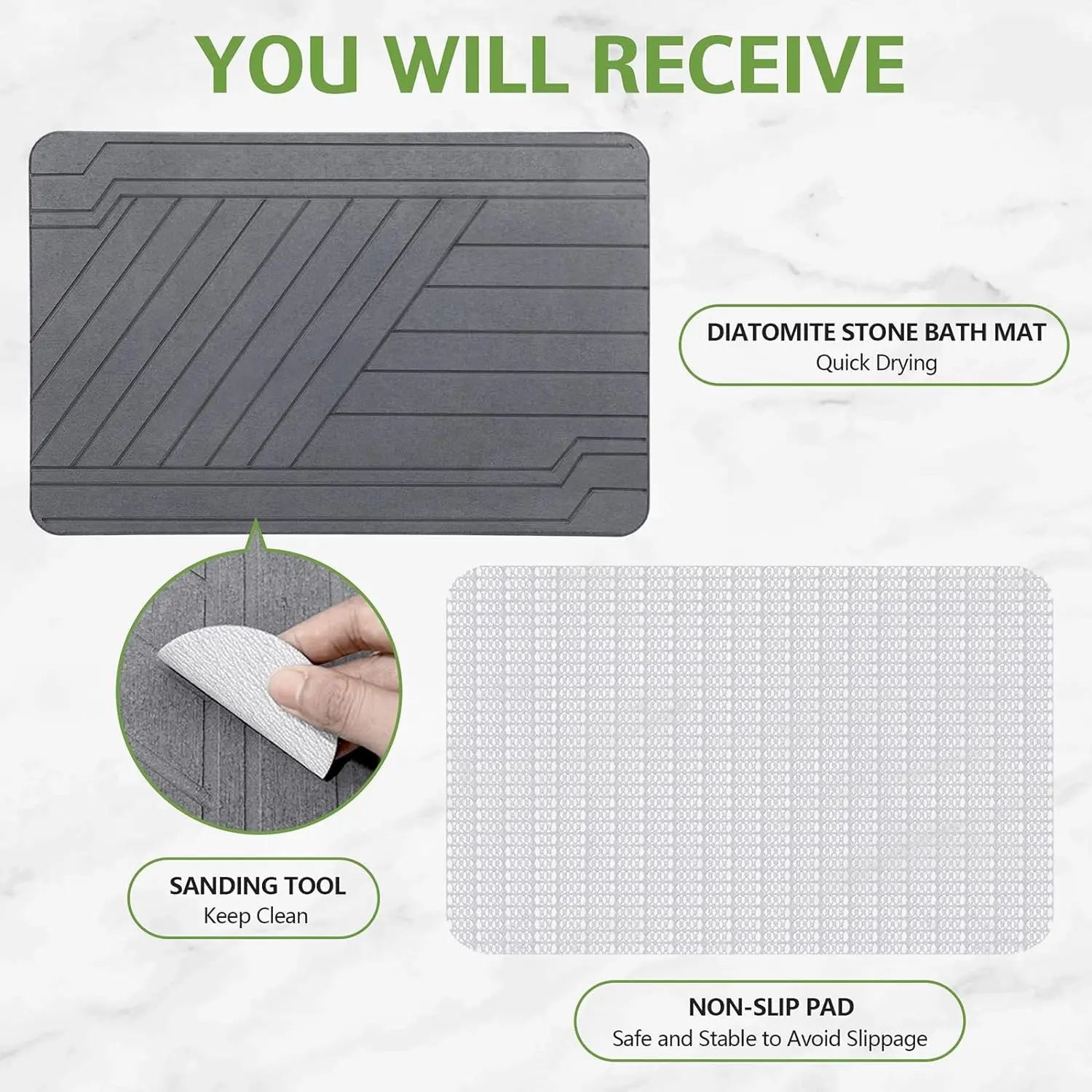 Uneven on the bathroom tile. Had to put the cloth mat down again and then the stone. Cloth mat doesn’t move with the stone on top and looks nice