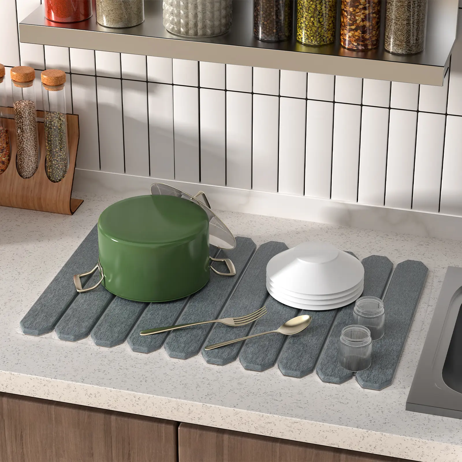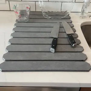 This stone dish drying mat works great. Dishes dry faster than using a fabric mat.