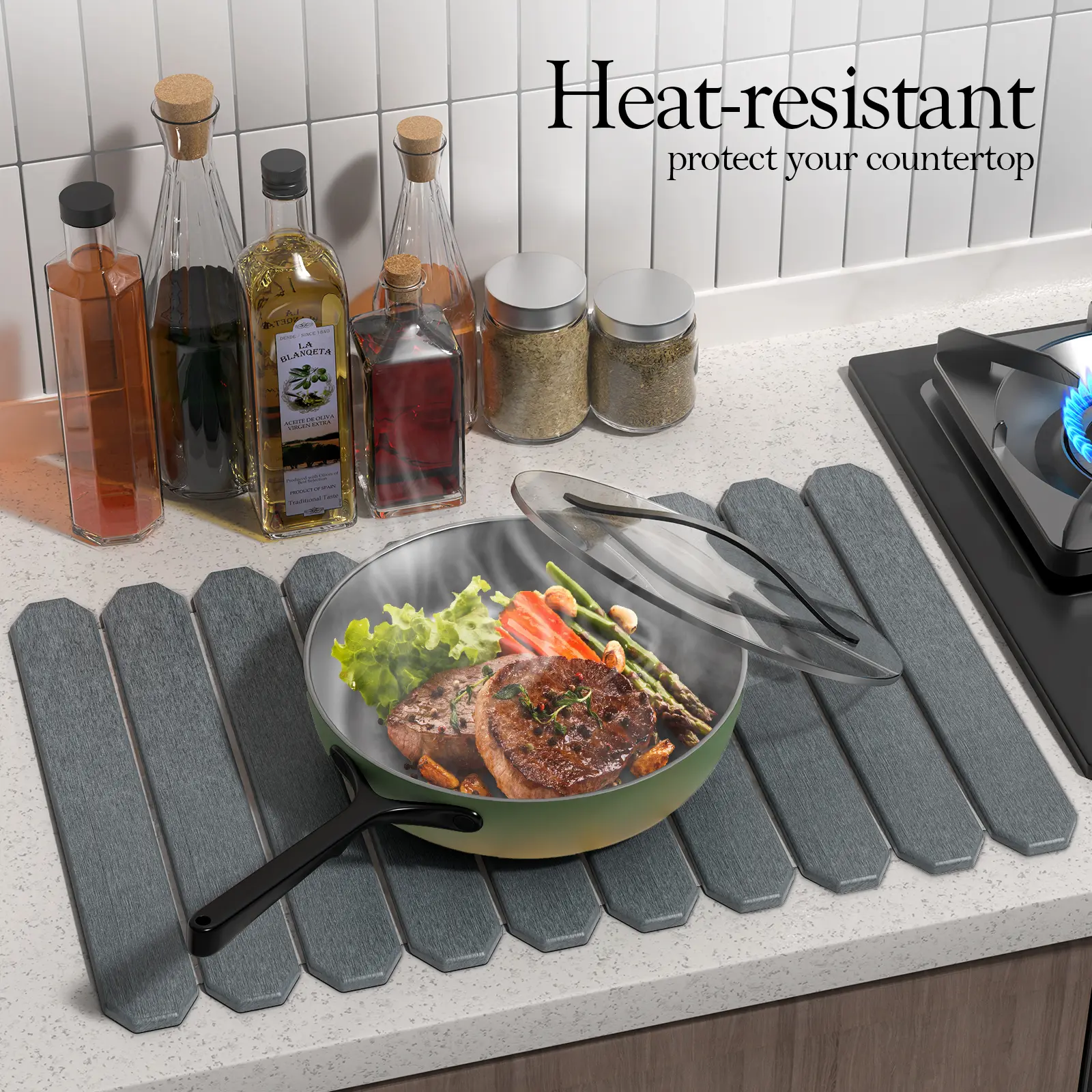 I love the way it just sits on my counter very modern and very cute. It doesn’t smell like when it does when you have a rag underneath or a mat the color I love it and It just tries immediately