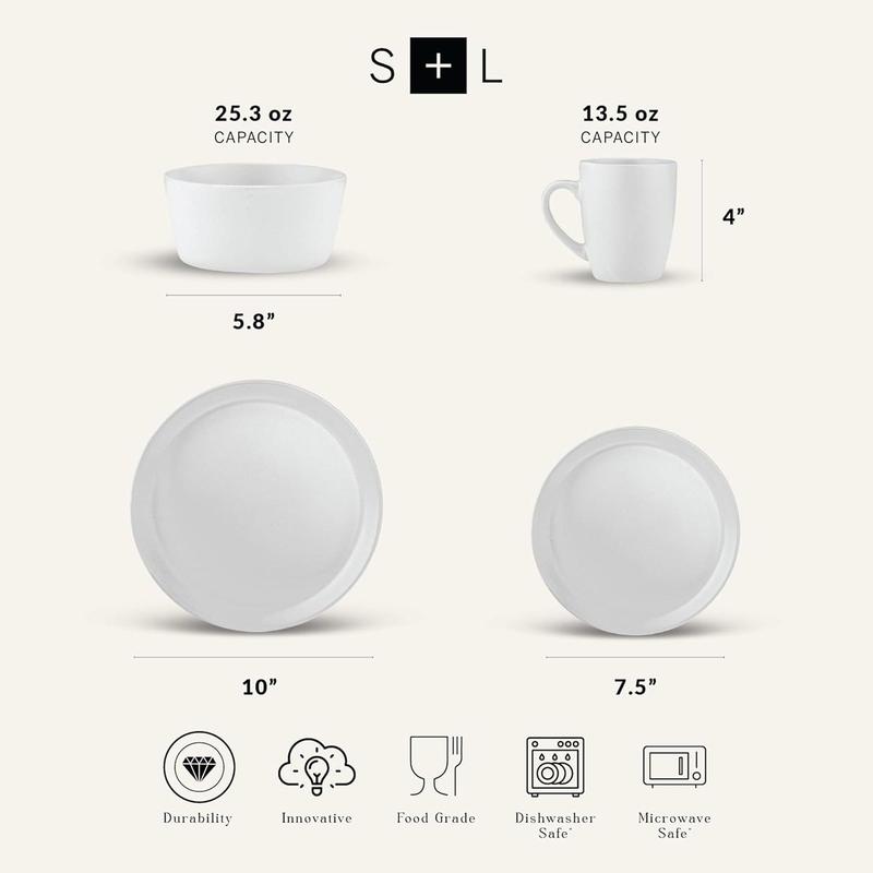 Elevate your dining experience with the Stone Lain Albie Stoneware Dinnerware Set, designed to bring effortless elegance to your table. Perfectly blending timeless charm with a modern twist, this dinnerware set features smooth lines, raised lipped edges, and a soft speckled finish, creating a clean, stylish look that enhances any meal. Whether you're enjoying a casual breakfast, a cozy lunch, or hosting a dinner party, this set is sure to impress.The set includes everything you need to serve meals for a party of eight: 4 large 10" dinner plates, 4 smaller 7.5" salad plates, 4 deep 5.75" bowls, and 4 easy-grip 12.5 oz mugs. With this complete set, you'll have the perfect pieces for any occasion, from casual family dinners to elegant dinner parties with friends. Made from durable ceramic stoneware, each piece is designed to withstand everyday use, offering lasting durability and style.For added convenience, the Stone Lain Albie Dinnerware Set is both microwave and dishwasher safe, making it easy to reheat meals and clean up after dinner. Whether you're just starting out in a new apartment or refreshing your existing kitchenware, Albie adds a touch of sophistication and functionality to any home.Stone Lain was founded with a simple yet powerful mission: to turn everyday meals into memorable occasions. With the Albie Dinnerware Set, you can enjoy unforgettable dining moments, where every dish looks better, tastes better, and feels just right. Make your meals more special and your kitchen more stylish with Stone Lain Albie—where elegance meets everyday functionality.