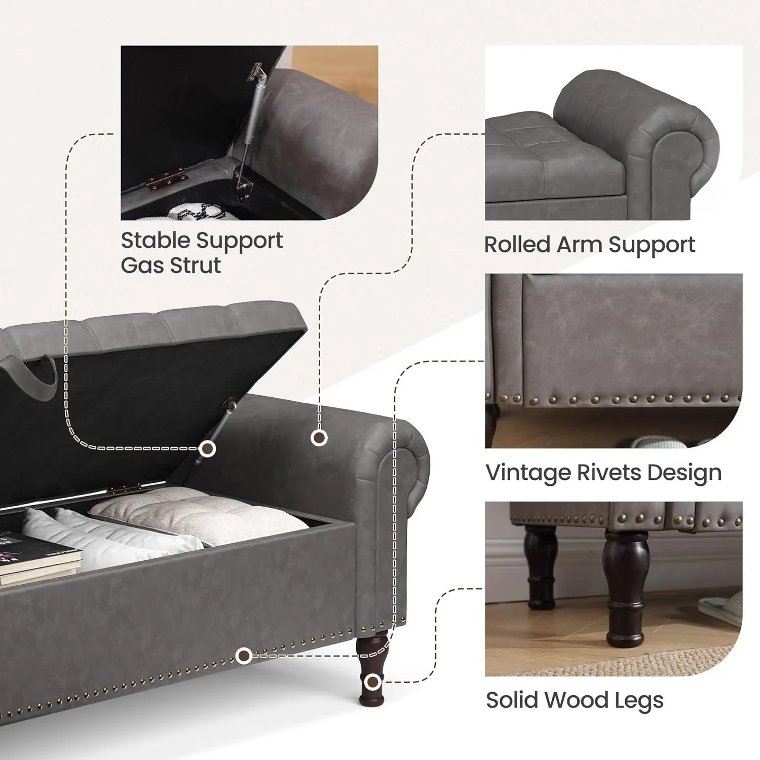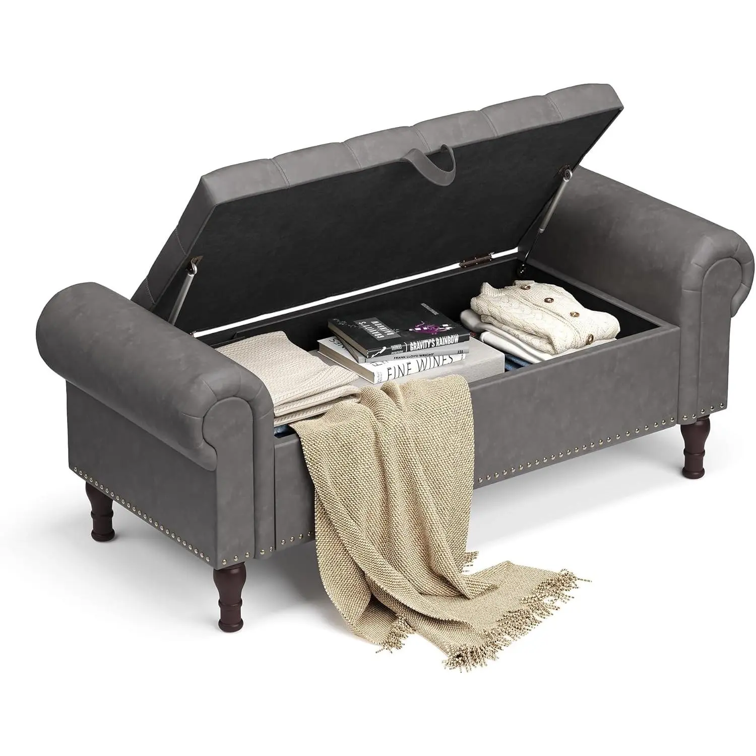 Very pretty! I paid $120, was worth it. The detail work isn't great but the front looks very good. I don't expect it to fall apart quickly or anything. The legs are solid wood, the finish of the "leather" is matte. The inside of the bench has a good amount of room, sloppy screw work inside.