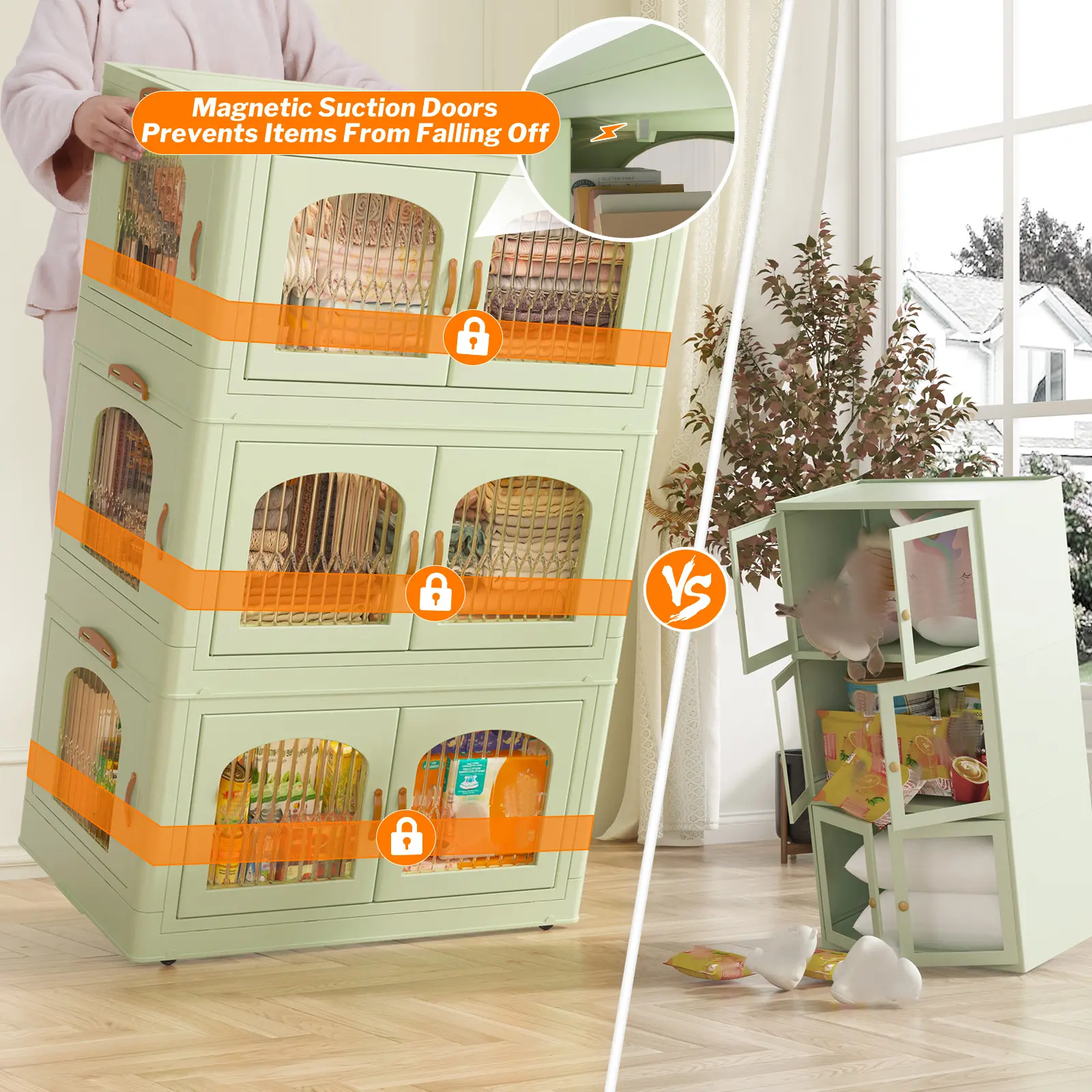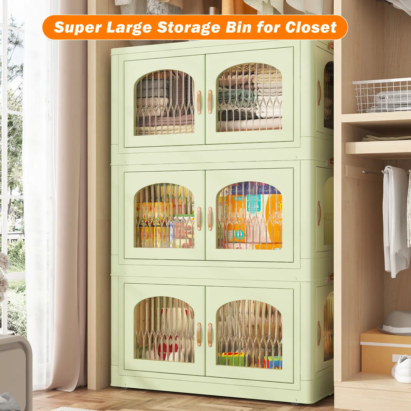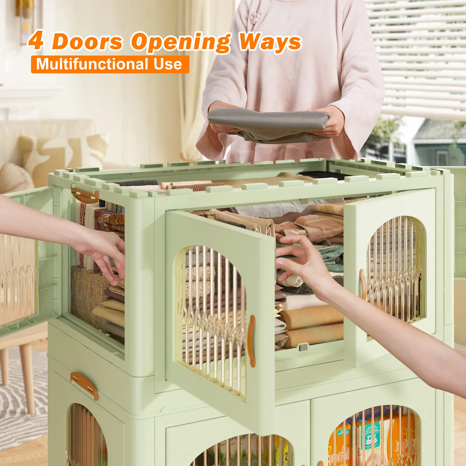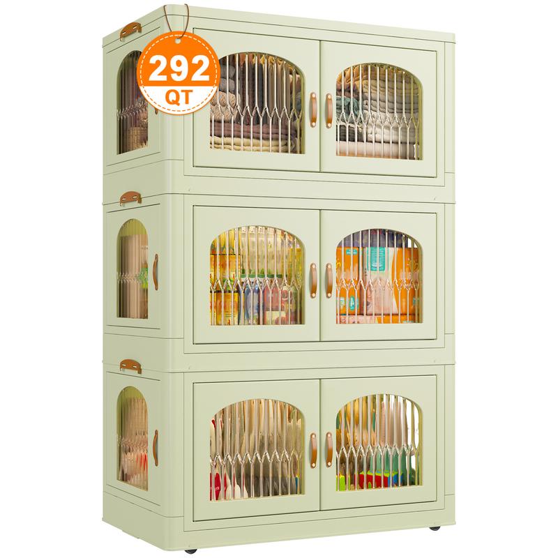 ·【Magnetic Door】 The side of the plastic storage bin for clothes are very convenient to use. The front and side doors can open 100 degrees, allowing you to place and take out clothes from different angles.