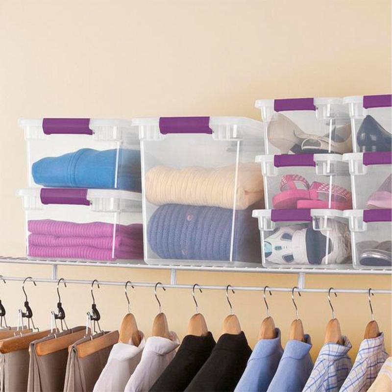 This 6-pack of durable storage totes is ideal for storing moving supplies, extra blankets, rainboots, off-season clothing, extra books, and more safely in your home, garage, attic, or storage unit. Whether you're safely storing and organizing everyday household items, off-season pieces, or long-term objects, you can quickly identify contents from the outside, thanks to the clear plastic design.
