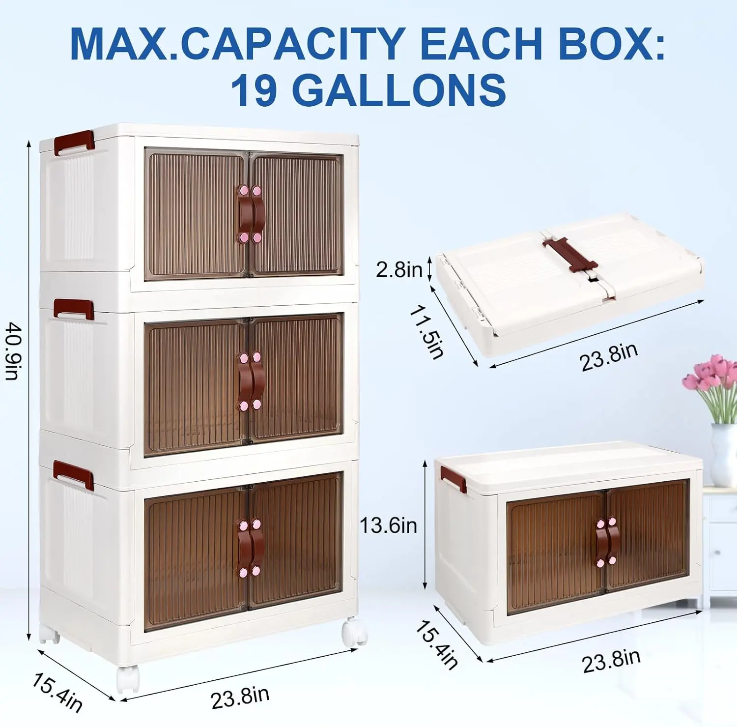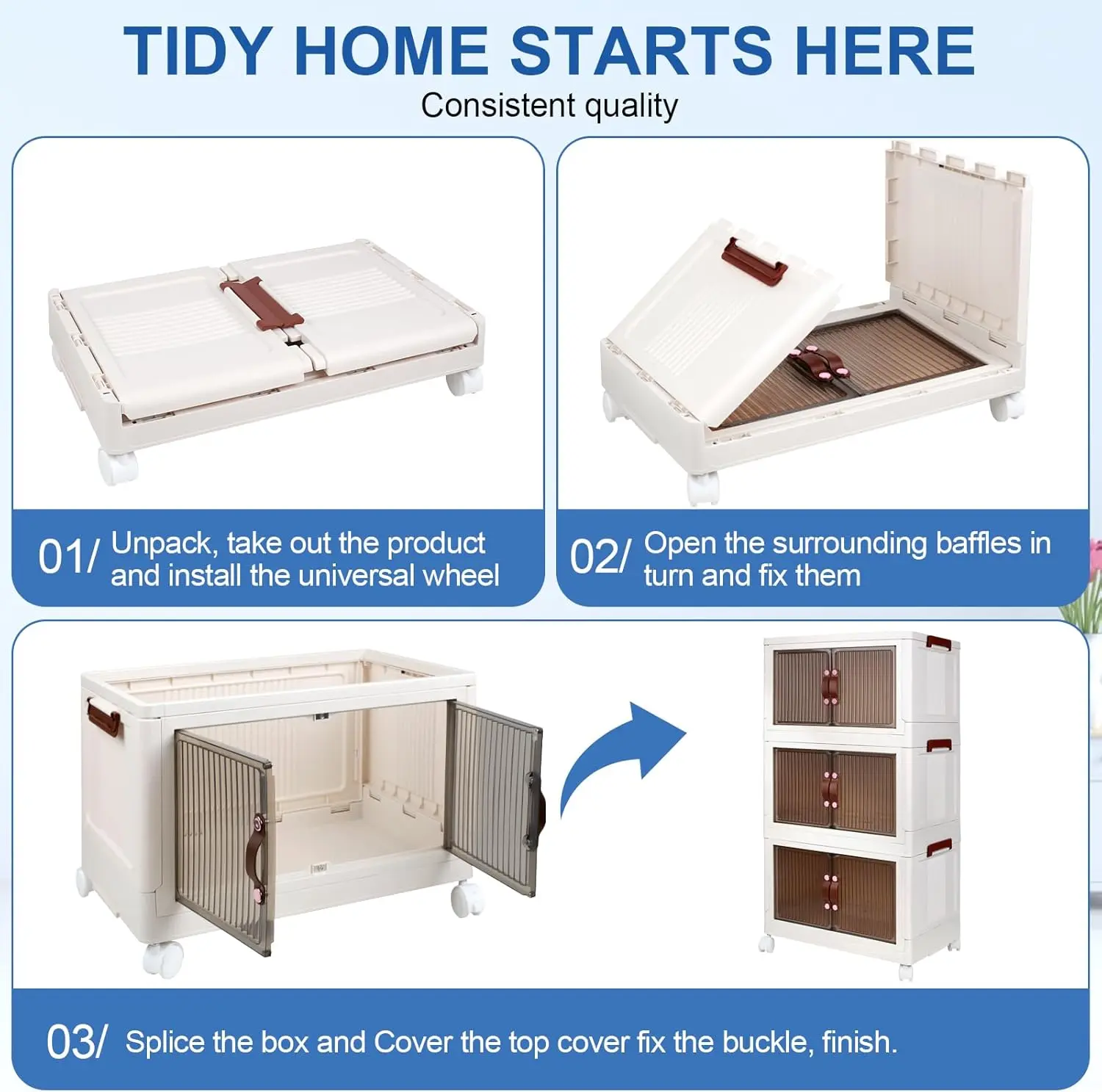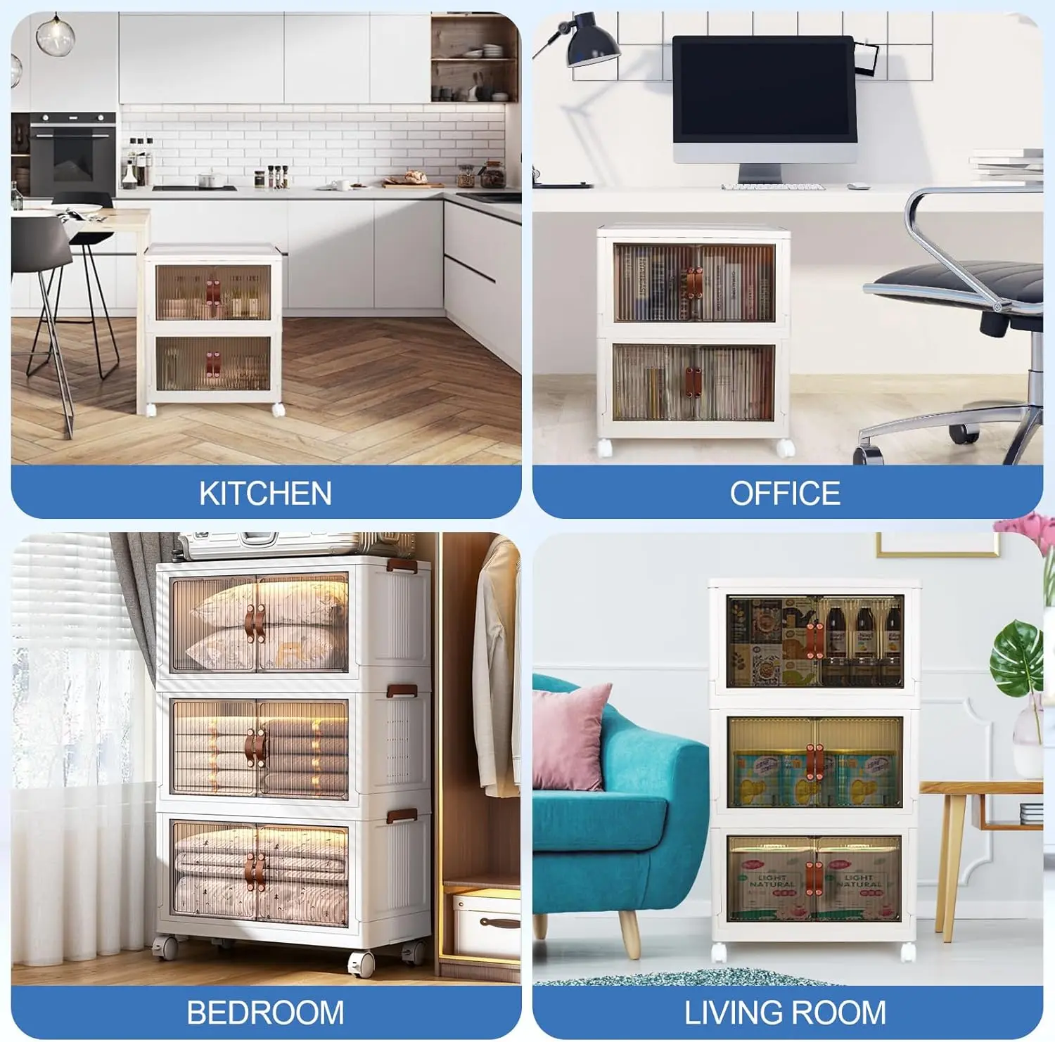 ·Durable & Stackable】The plastic collapsible storage bins are made of durable and heavy-duty PP material, which is sturdy, odorless, and durable. Built in four easily maneuverable wheels on the bottom it is able to move when doing cleaning. It is stackable and allows to stack storage cabinet together tightly. When they are not in use, the collapsible storage bins can be folded up and stay under the sofa, which will not take up space.