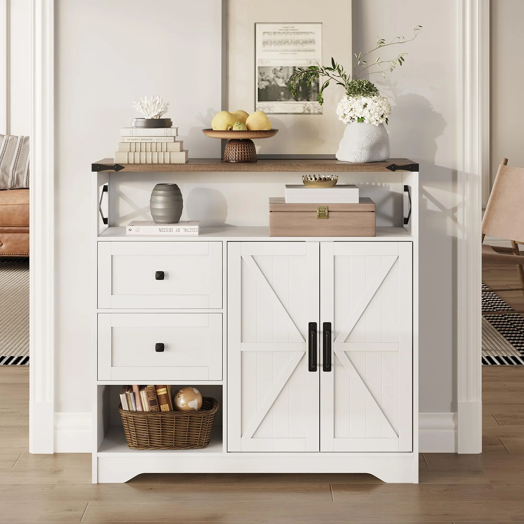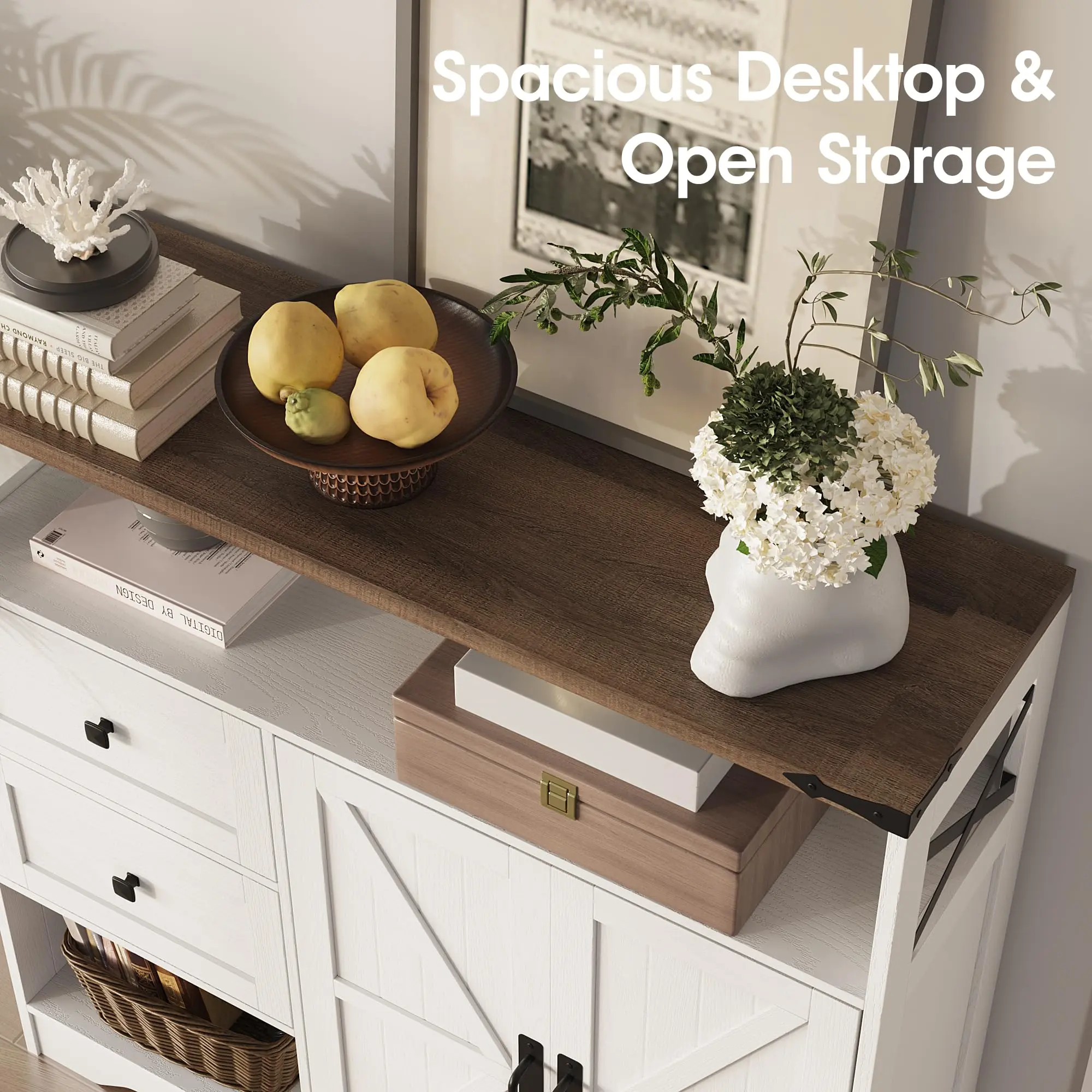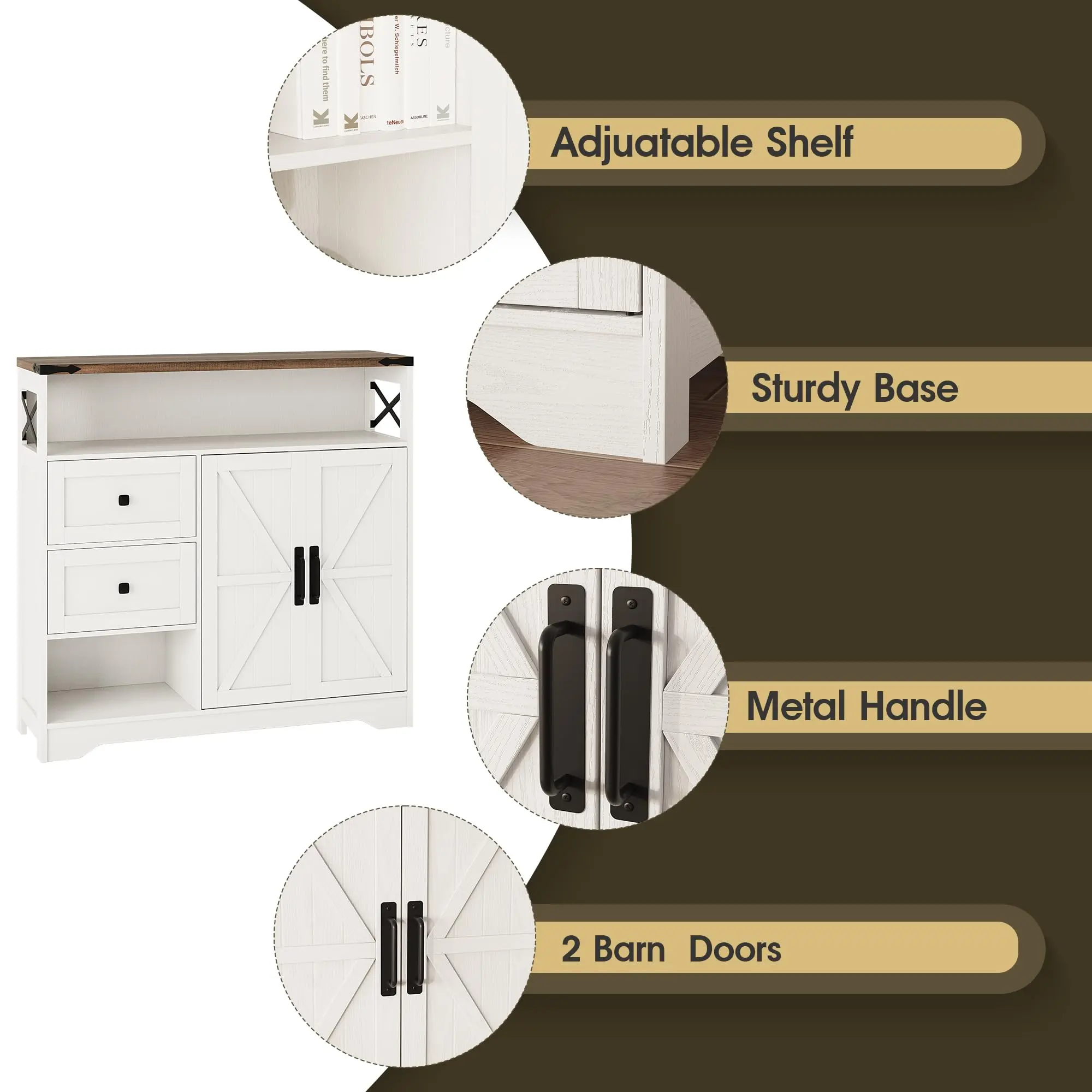 Farmhouse Style Design: Crafted from high-quality engineered wood, our storage cabinet is designed with classic barn door and 2 Drawers,adding warmth and texture to your home while also serving as a decorative piece to enhance the overall room style.