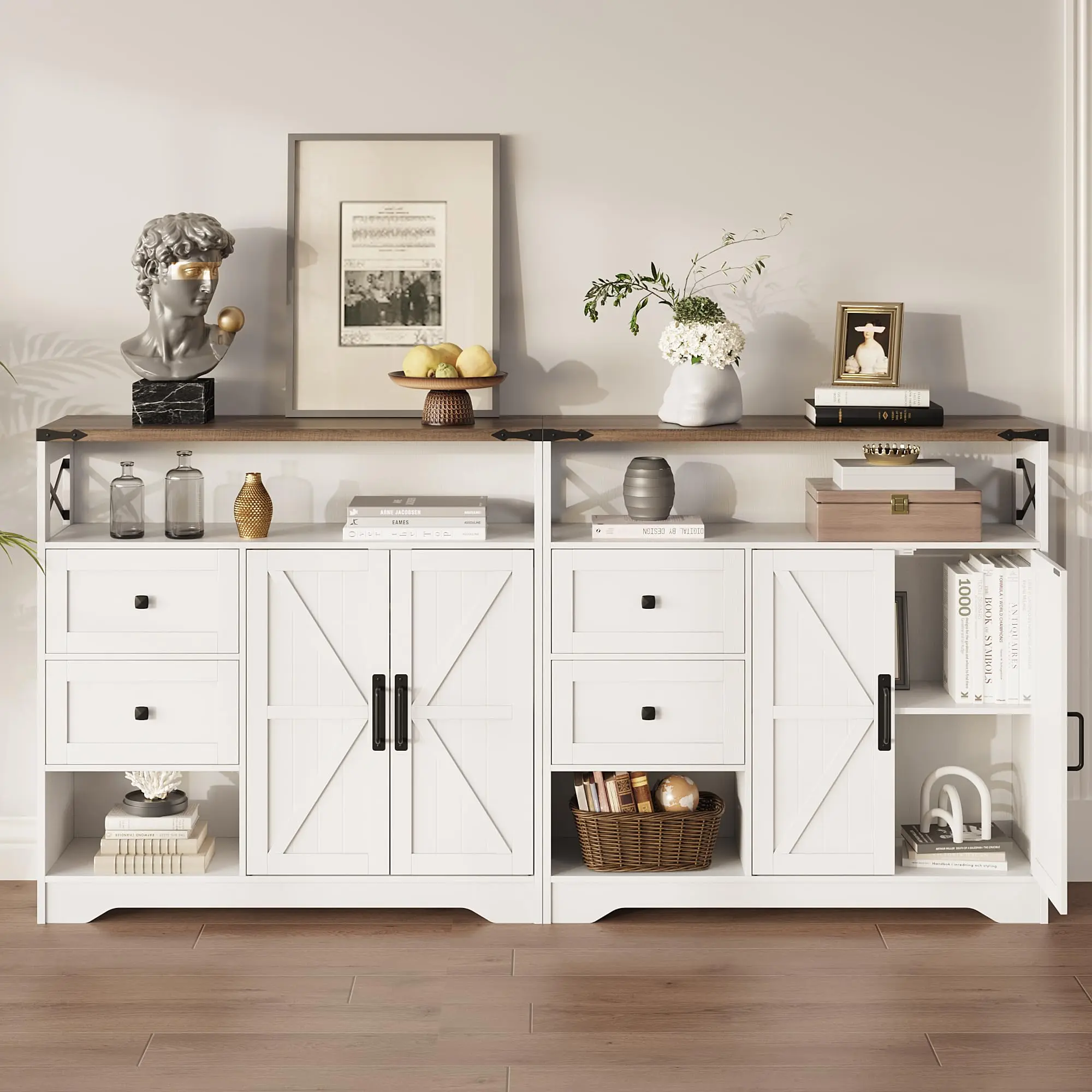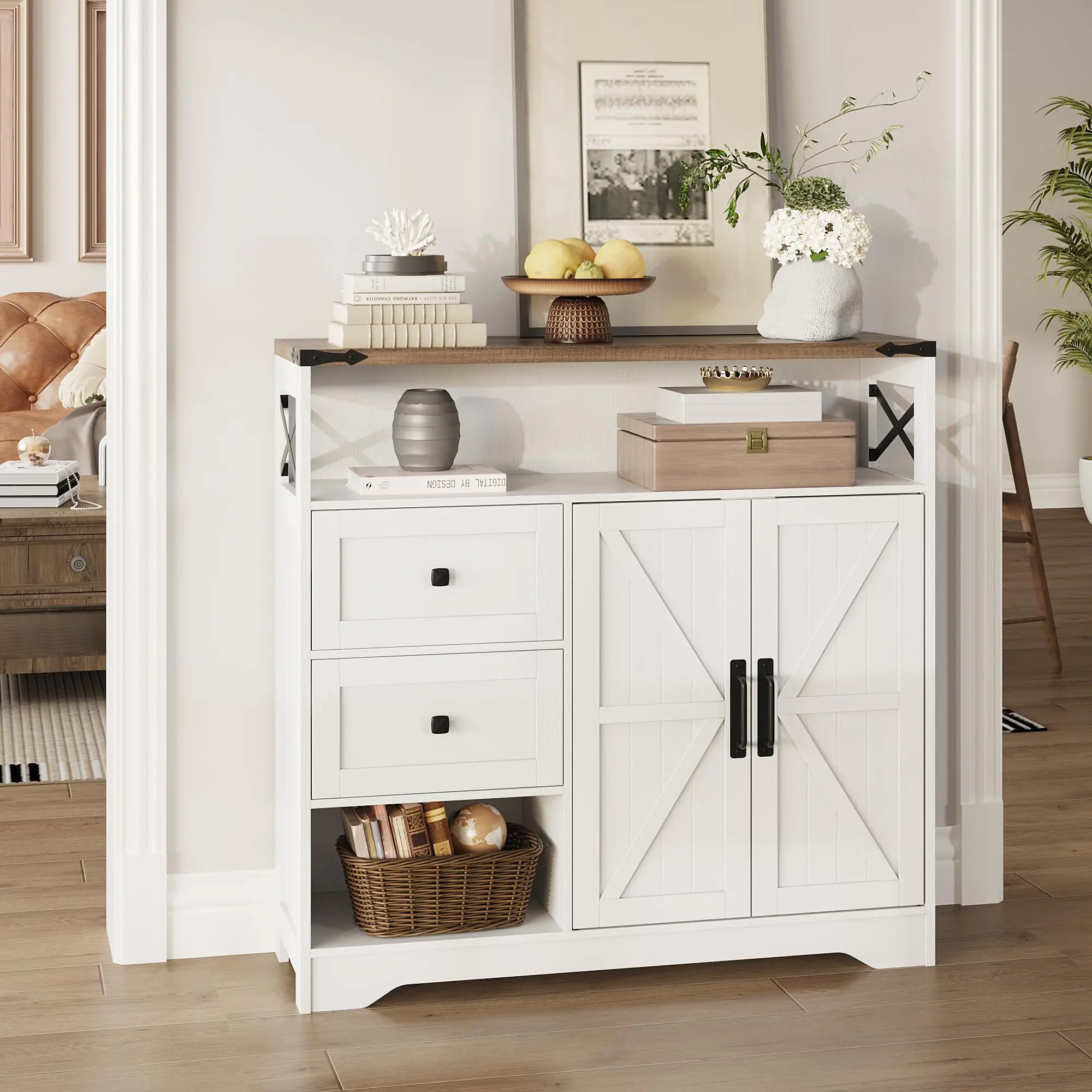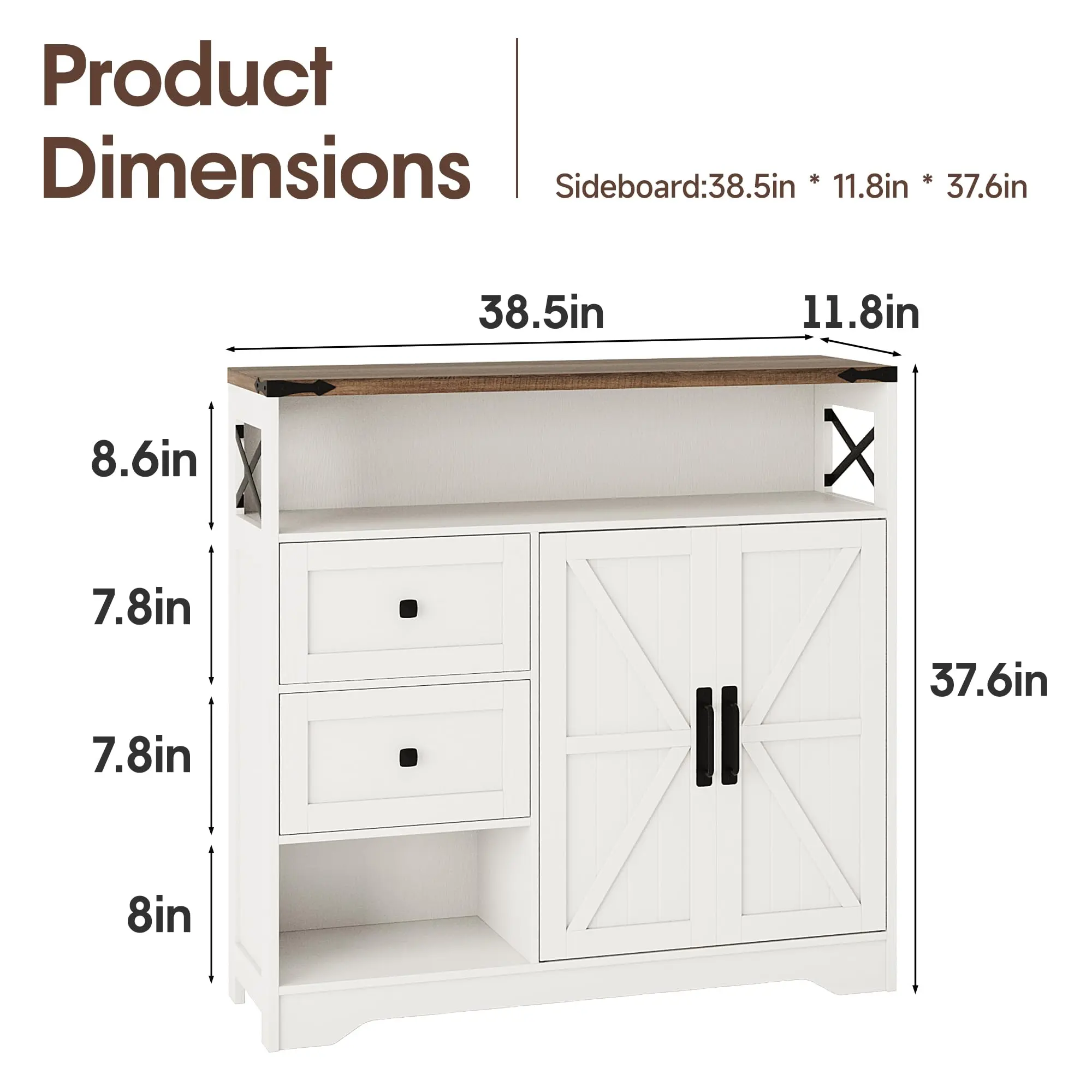Farmhouse Style Design: Crafted from high-quality engineered wood, our storage cabinet is designed with classic barn door and 2 Drawers,adding warmth and texture to your home while also serving as a decorative piece to enhance the overall room style.