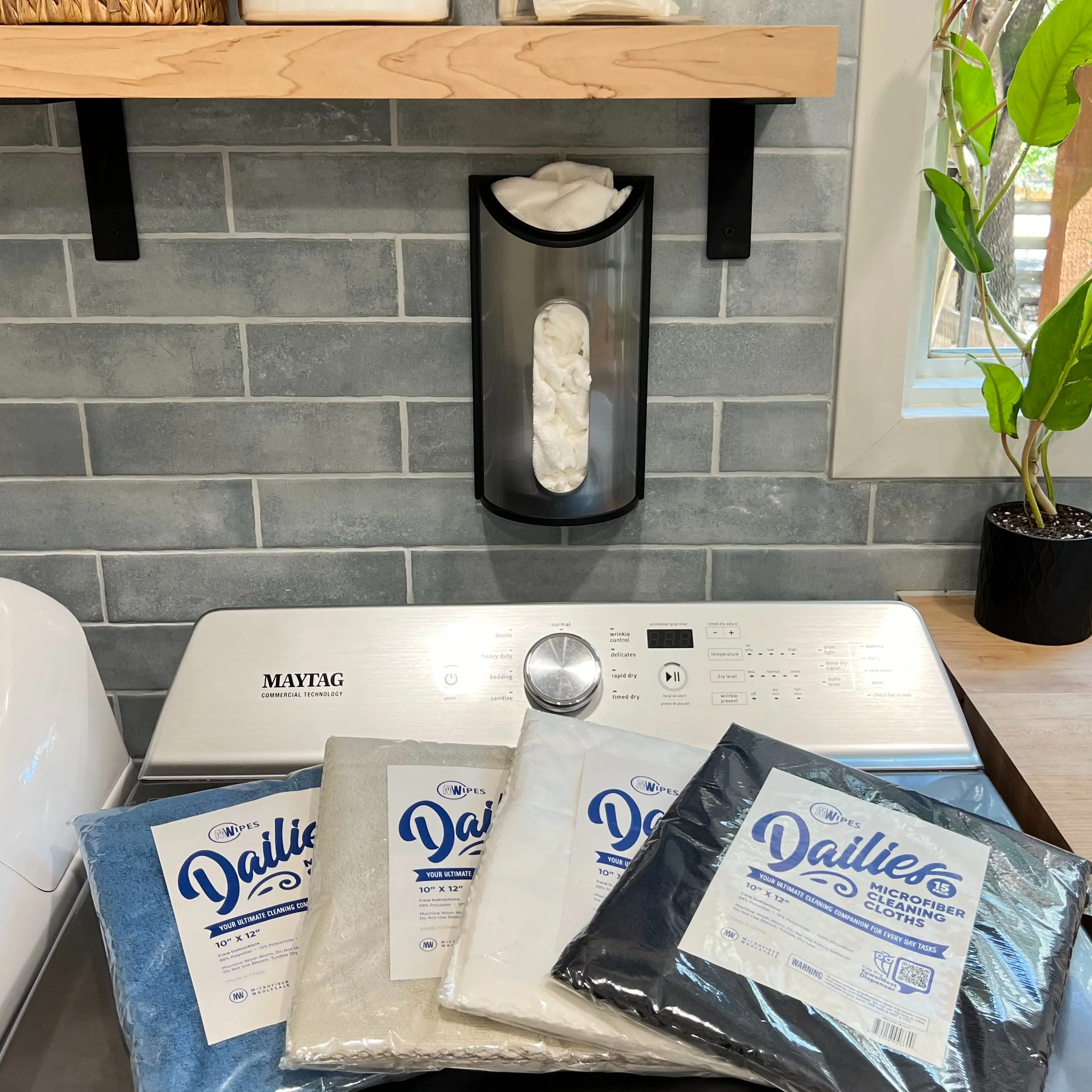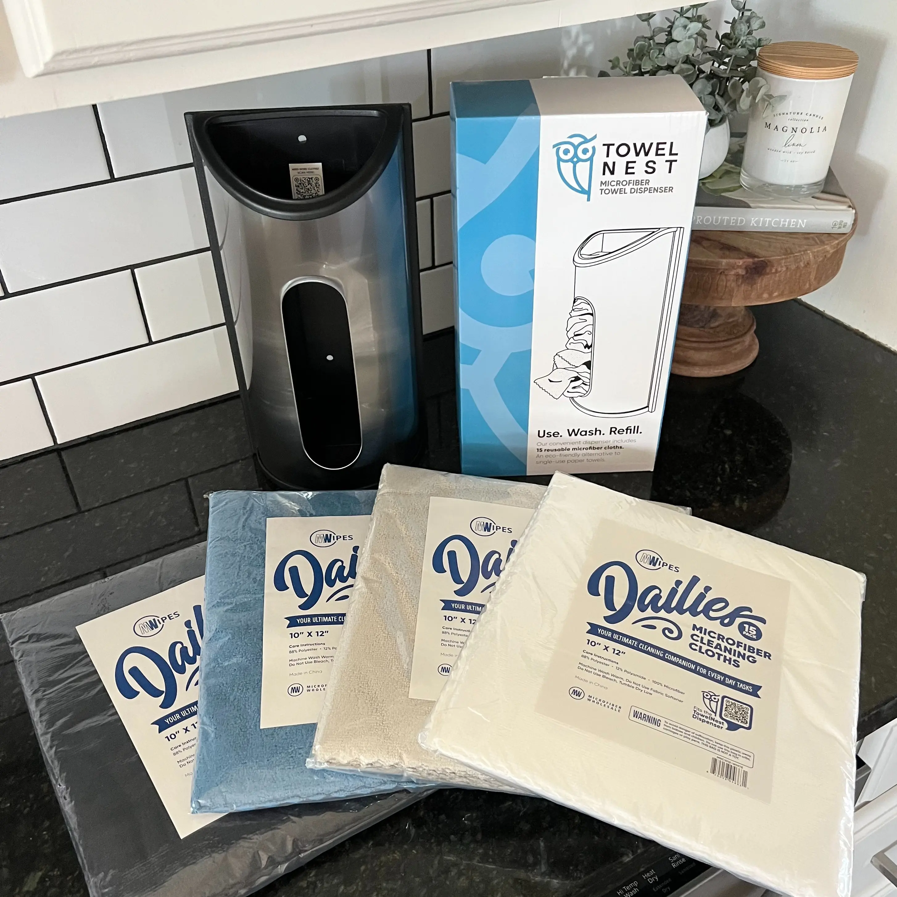 The TowelNest Dispenser Set is the modern way to keep your home clean, organized, and eco-friendly. Each set includes a sleek wall-mountable dispenser and 15 reusable blue microfiber towels — soft, ultra-absorbent, and washable.