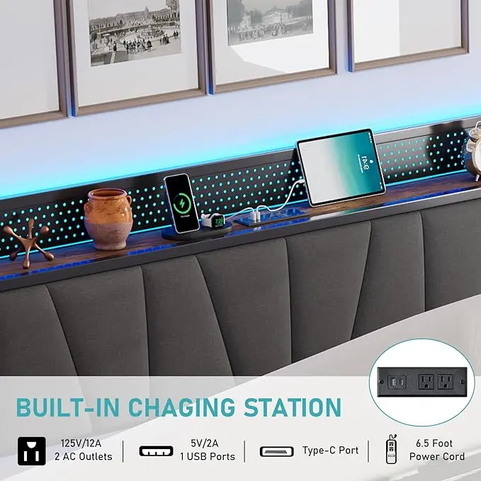·【Multifunctional Headboard】The king size bed has a newly upgraded soft bed headboard and is equipped with a built-in charging station with USB and Type-C plugs to conveniently charge mobile phones, computers or other devices to meet your daily needs.