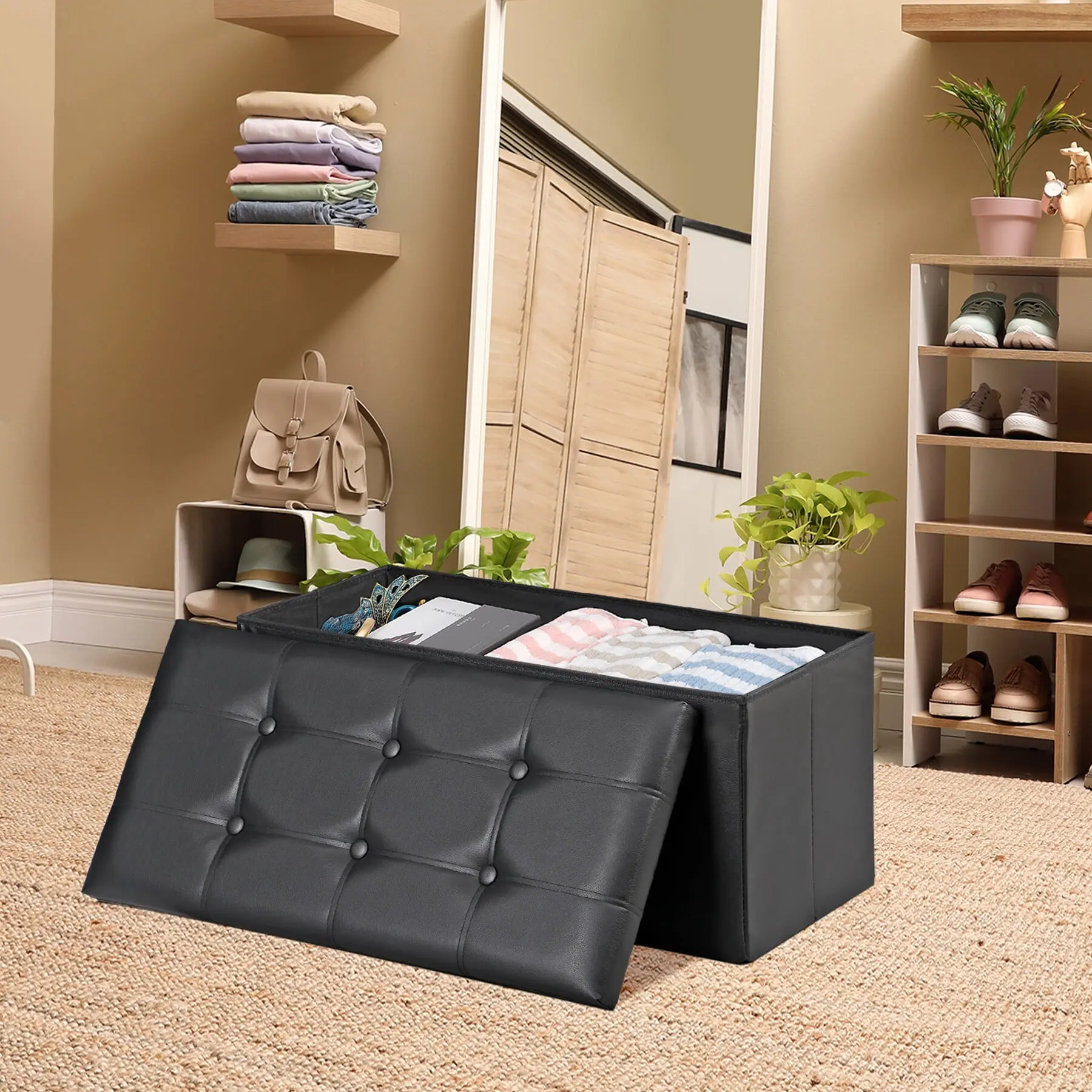 Collapsible design makes our storage furniture more flexible to use and store. Fold it flat when not in use, and it takes up little space for storage. The PVC Leather surface is waterproof and easy to clean.