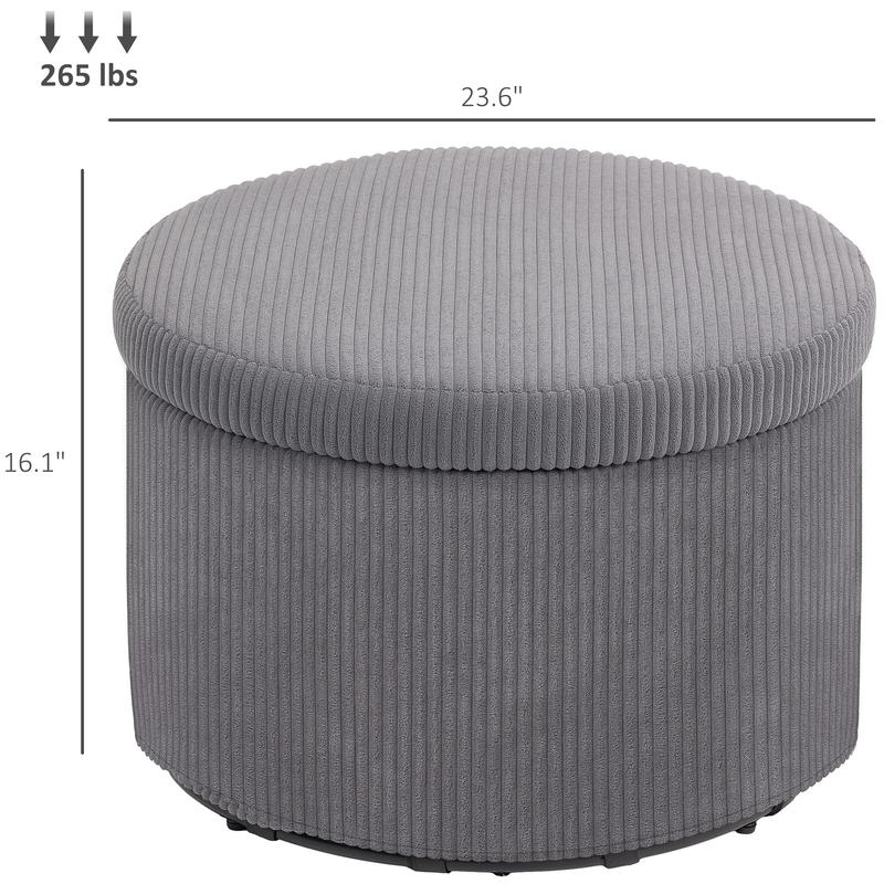 Discover the charm of the round storage ottoman from HOMCOM, where style meets functionality. This pouf ottoman is not just a feast for the eyes with its plush corduroy fabric and high-density foam but also a secret keeper with 25.6 gal of hidden storage beneath its lid. Double it as a footstool or an extra seat to add a cozy touch to any room.