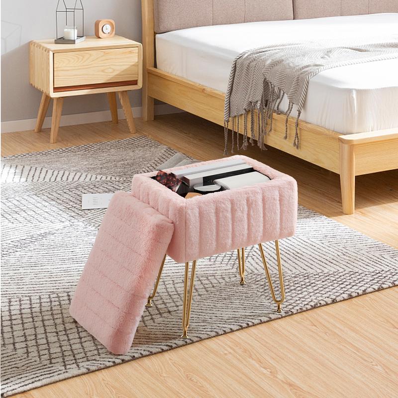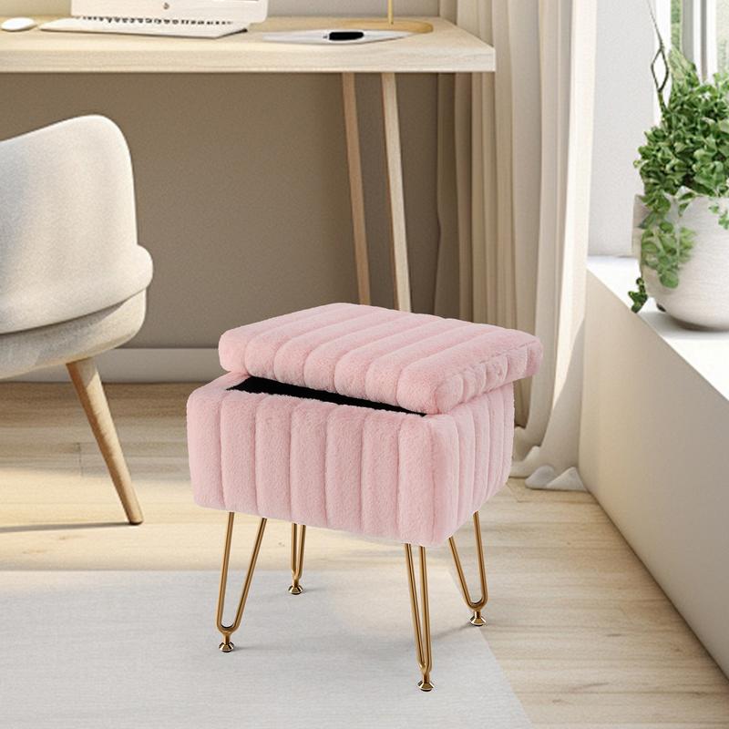 This compact and stylish ottoman offers a perfect blend of functionality and elegance. The soft plush top opens to reveal hidden storage, while the gold metal legs provide a luxurious finish, making it a chic addition to any bedroom, living room, or office.