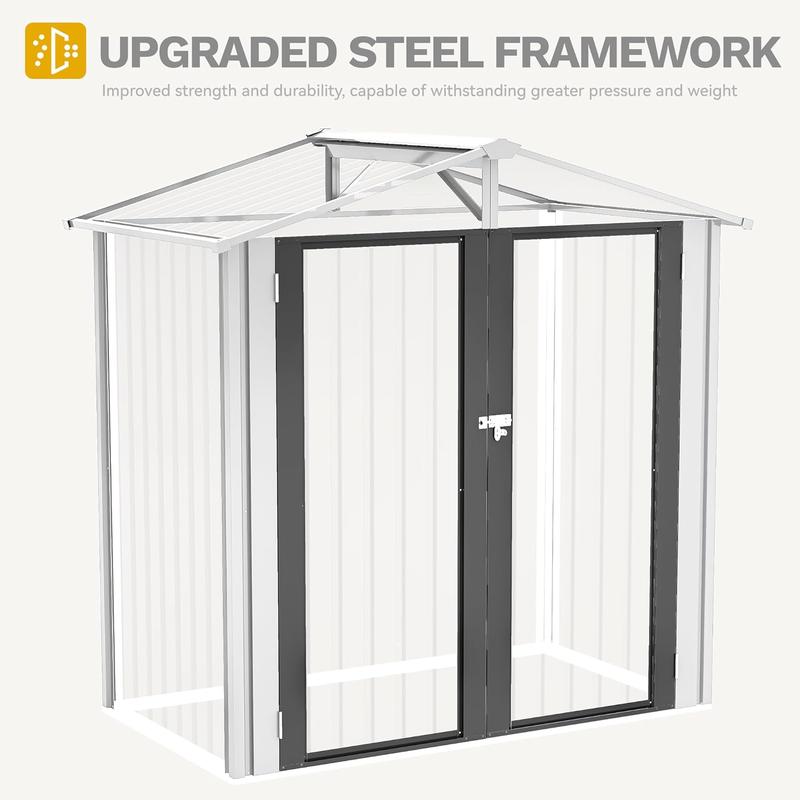 Weather Endurance: Built to last, our bike storage shed is crafted from galvanized steel, offering exceptional resistance to rust and harsh weather; With overlapping panels, a sloped roof, and a sturdy metal base, it ensures durability for long-term use
