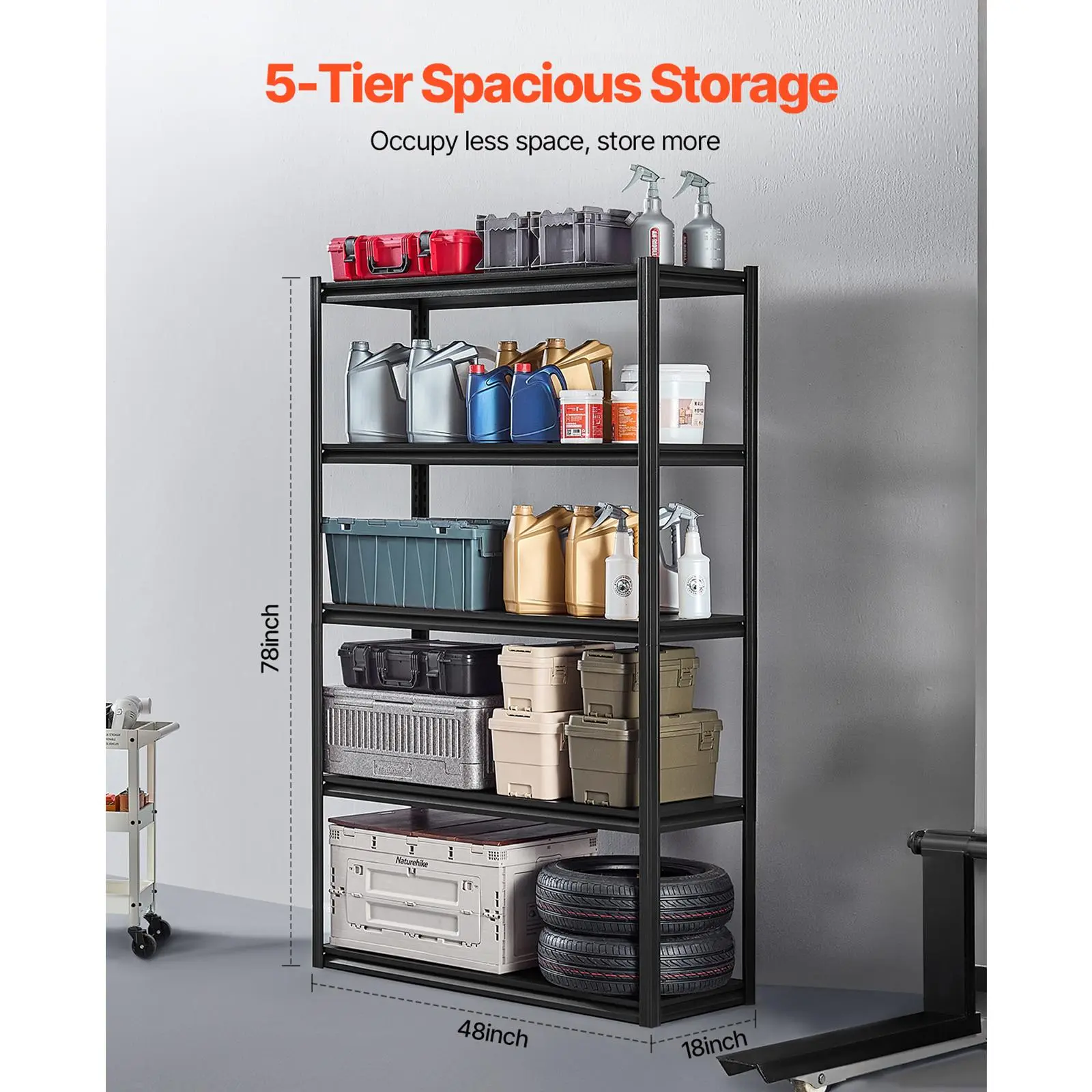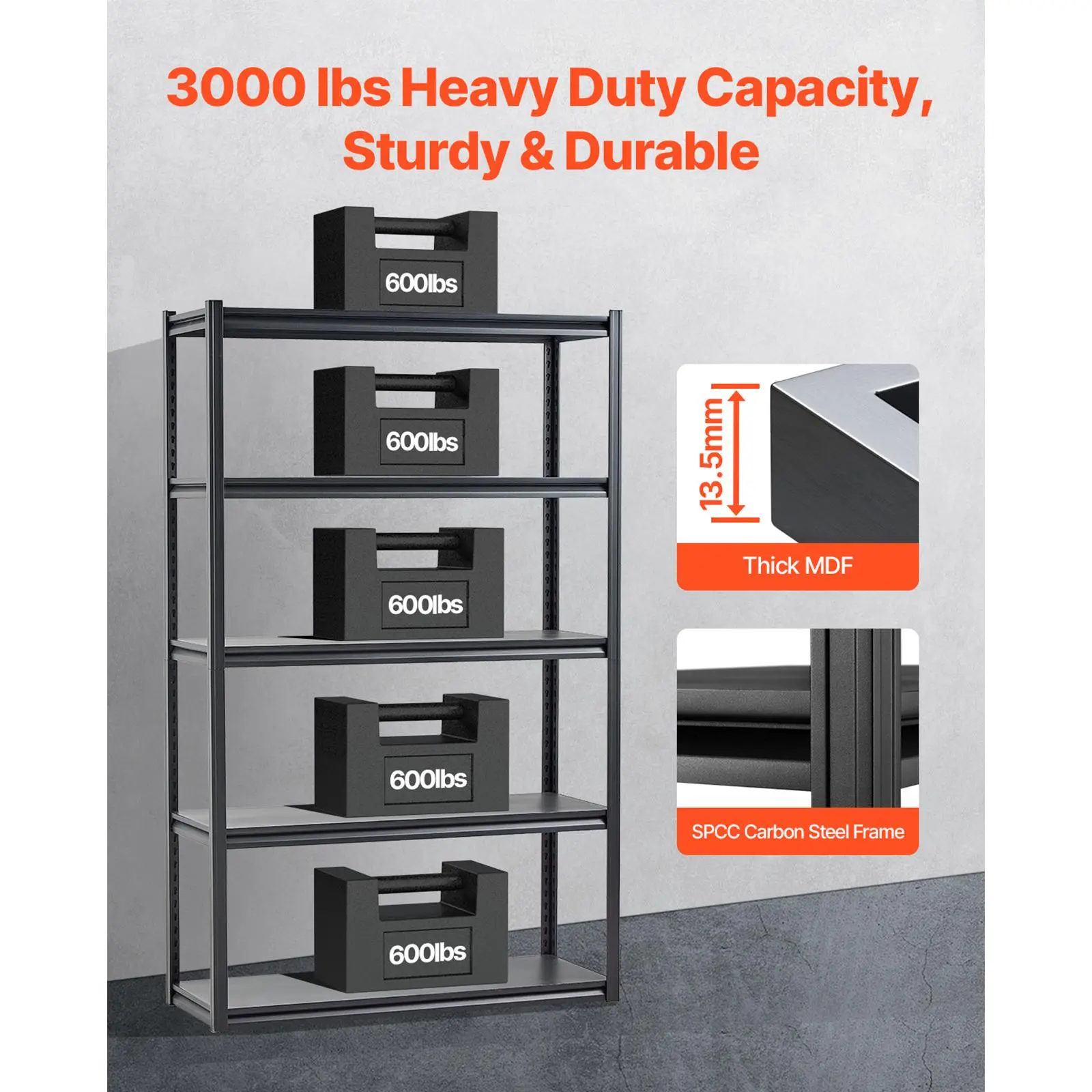 • 3000 lbs Load Capacity: With a total capacity of up to 3000 lbs, each garage shelf holds 600 lbs, allowing you to store more items and tools in your garage or warehouse.
