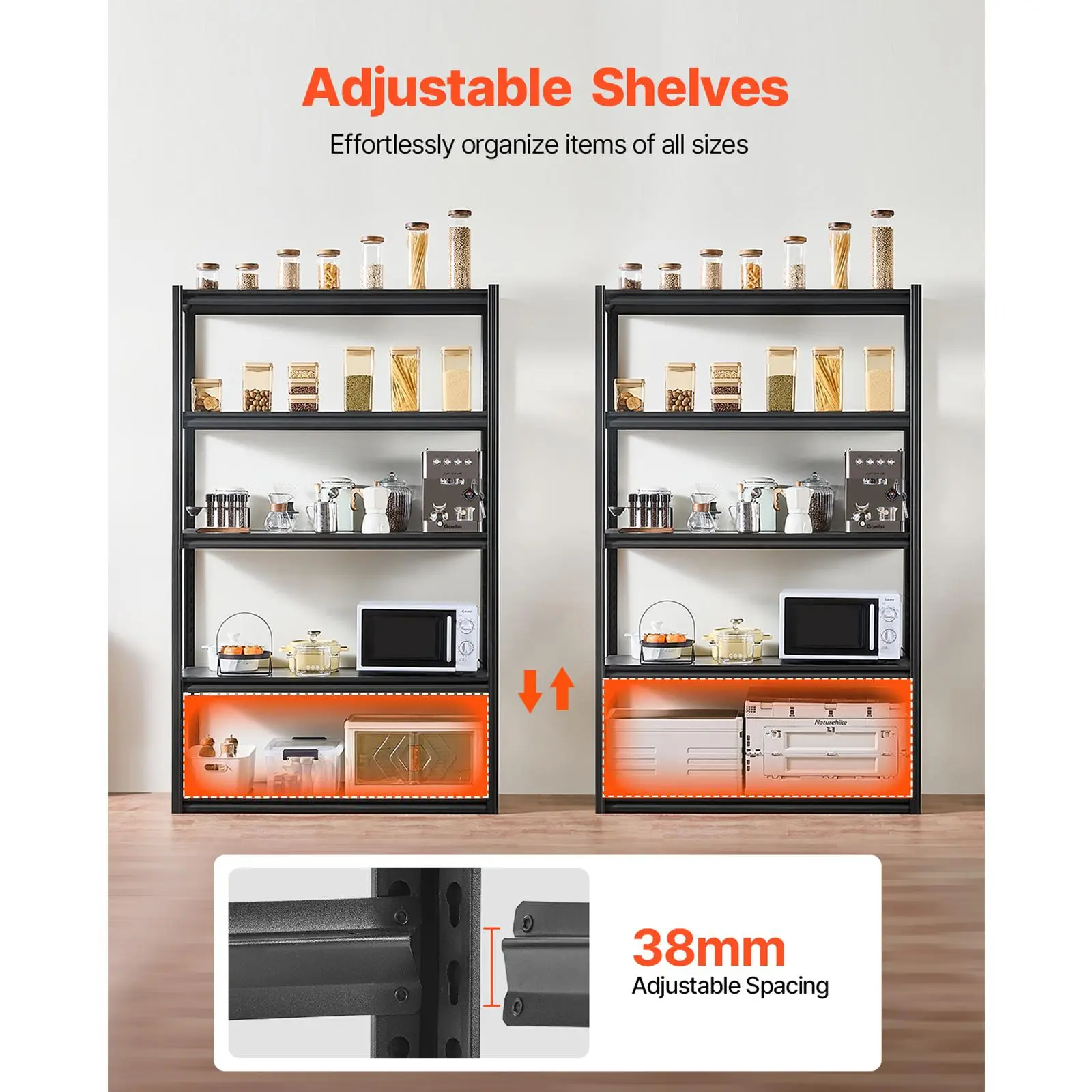 • Flexible Design: The height of our metal shelf is fully adjustable with a convenient quick-adjust mechanism. Using the included locking clips, you can adjust the shelves in 38 mm increments, making it easy to store items of various sizes and maximize space efficiency.