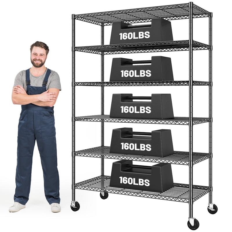 ·[Excellent Load-bearing Capacity] -750LBS garage shelving is made of strength steel tubing and reinforcing bars. Each shelf supporting up to 125LBS. 490 lbs on wheels when not moving,up to 300 lbs on wheels when moving.