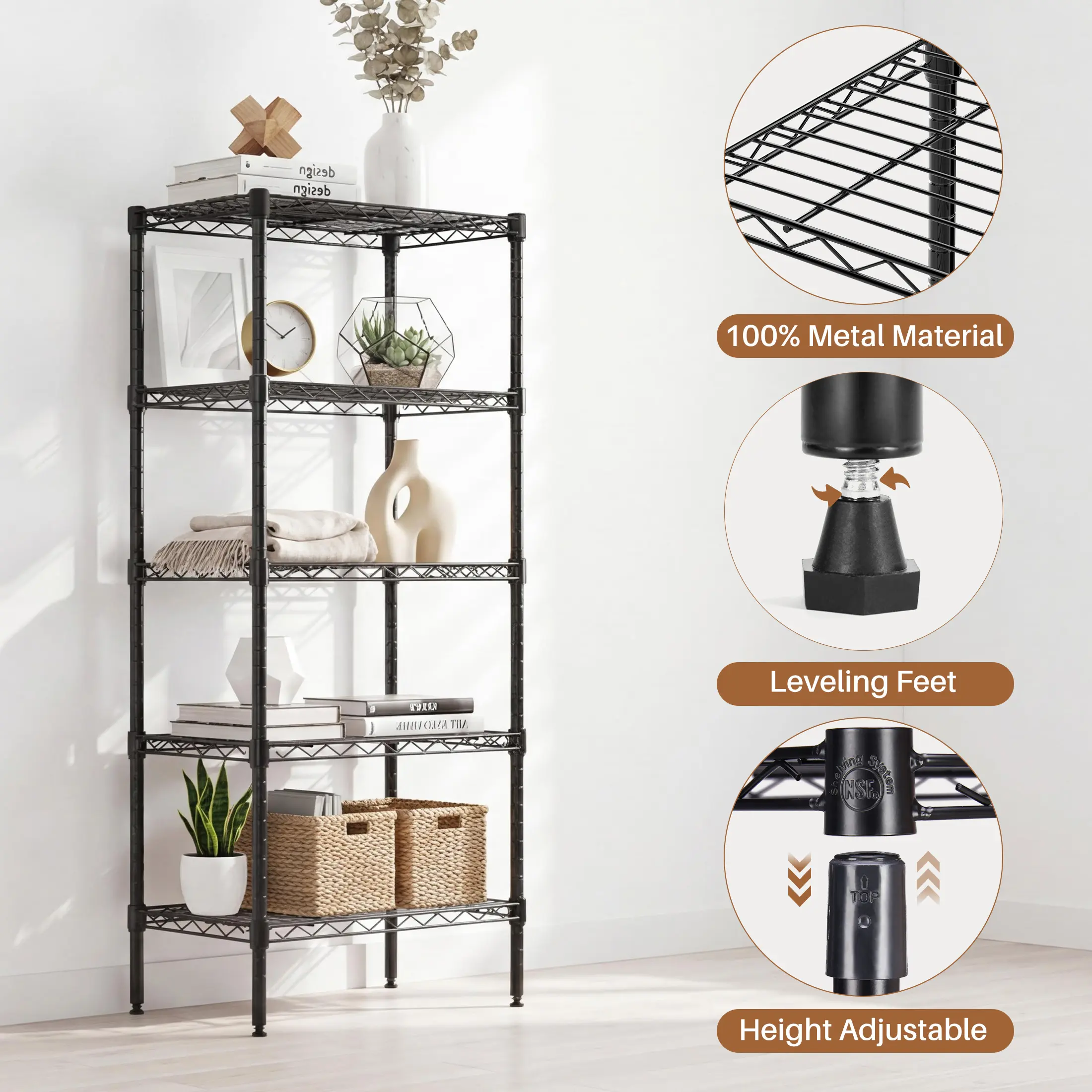 【Adjustable Height】The wire shelf organizer adopts an adjustable design, allowing you to customize the height of each layer according to your storage needs, providing flexibility to accommodate different items and ensuring a clean and orderly space