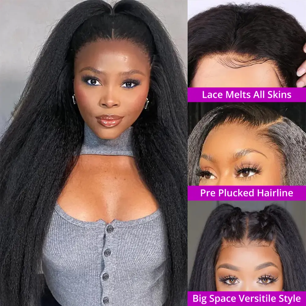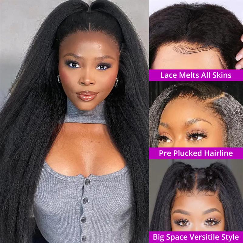 13x6 Kinky Straight HD Lace Front Human Hair Wigs for women. Crafted from 100% unprocessed Brazilian virgin hair, these wigs offer a natural hairline with baby hair. Super silky and bouncy, they promise no shedding, no smell, and no tangling. Perfect for those seeking a luxurious, natural look.