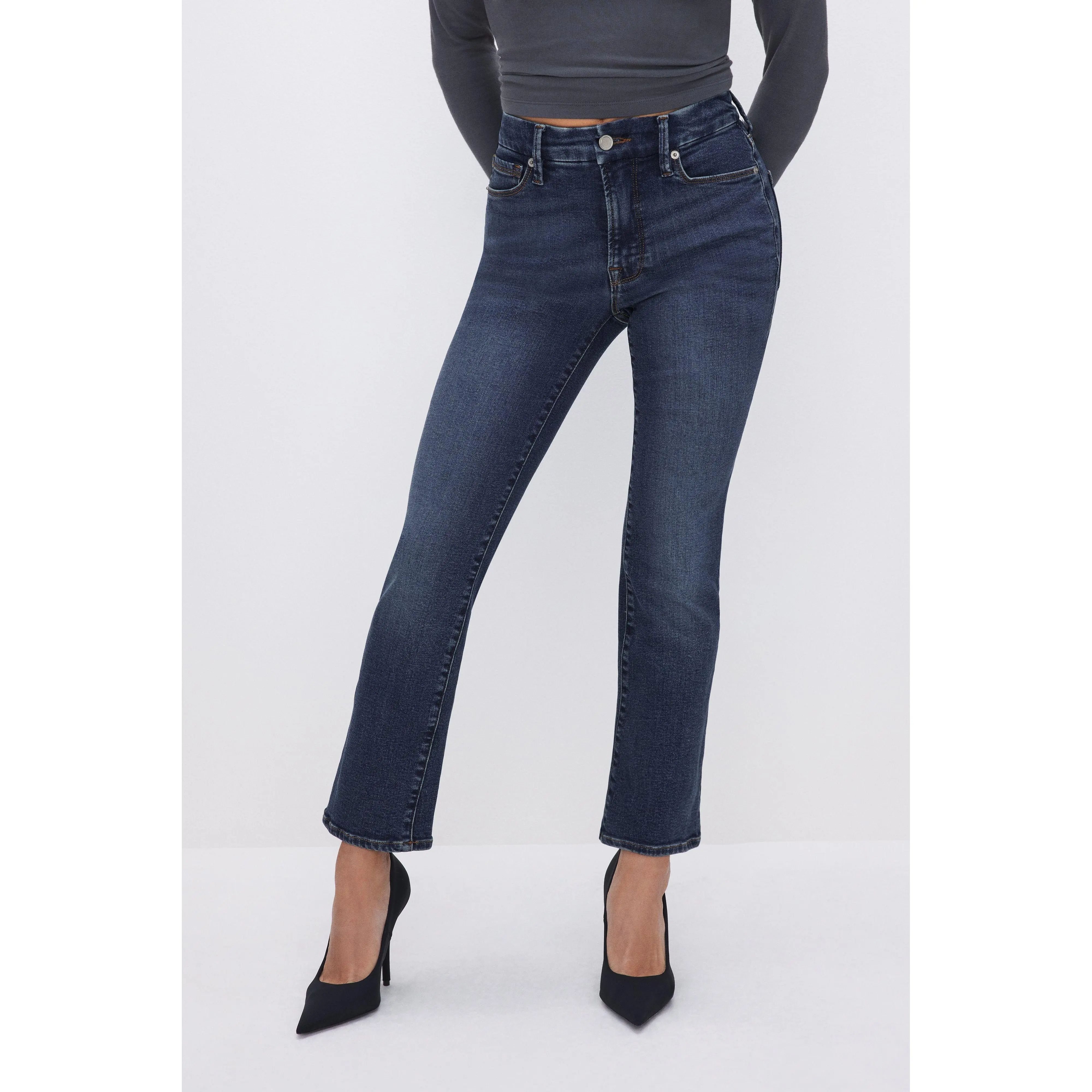Oh.My.Gosh! It looks amazing on my 5'0" body. I have not found a pair of jeans that look this good on me in a long long time. My husband happily agreed while starring at me with my jeans on. For reference I am 155 lbs. The jeans hit perfectly just below my ankle.I am to order another pair for sure.