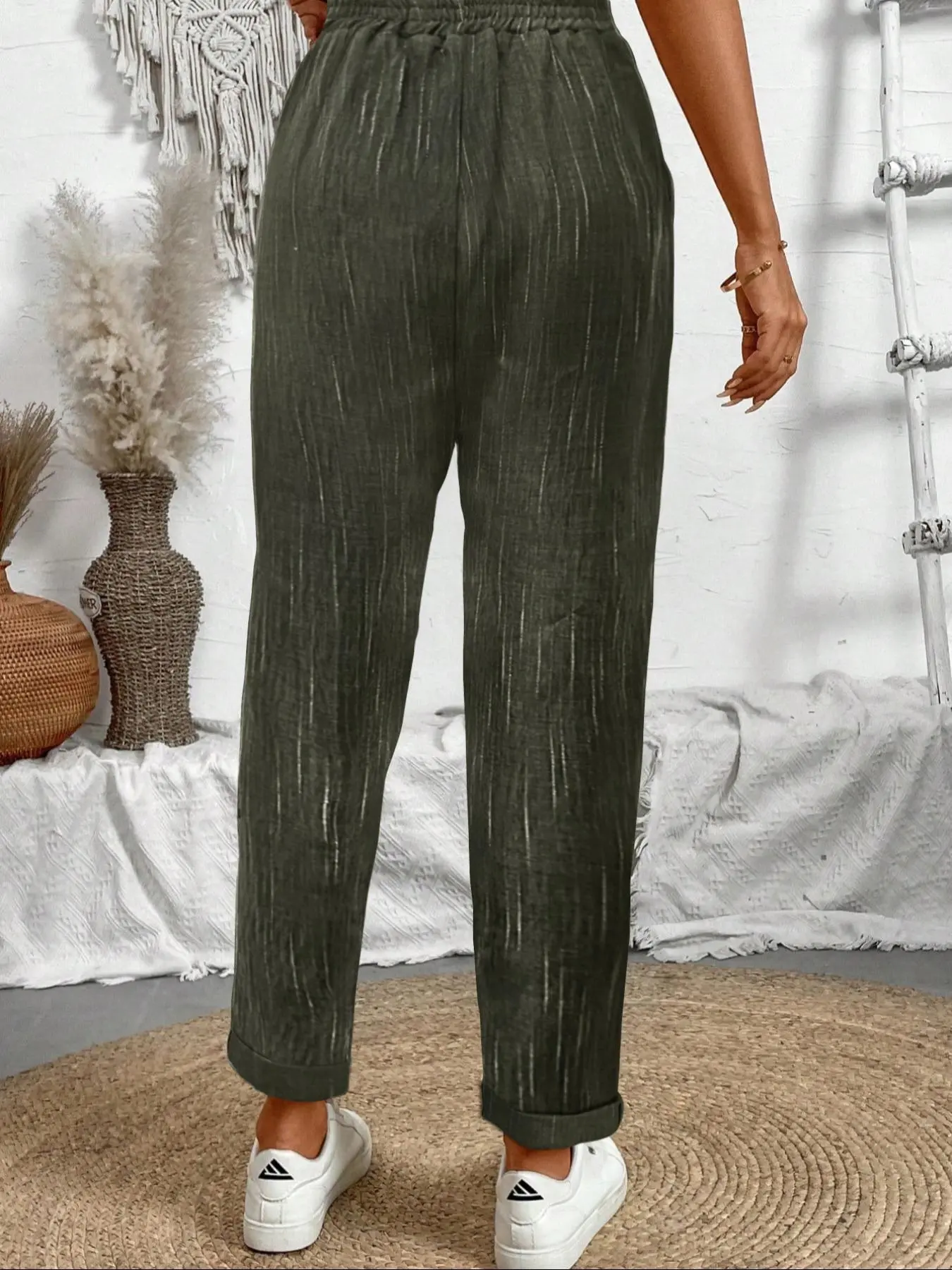 Super comfy. Nice stretch in waste band. No messy looking wrinkles, dress them up or wear them casual around the house. Will buy more