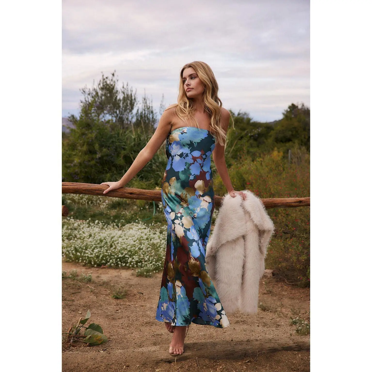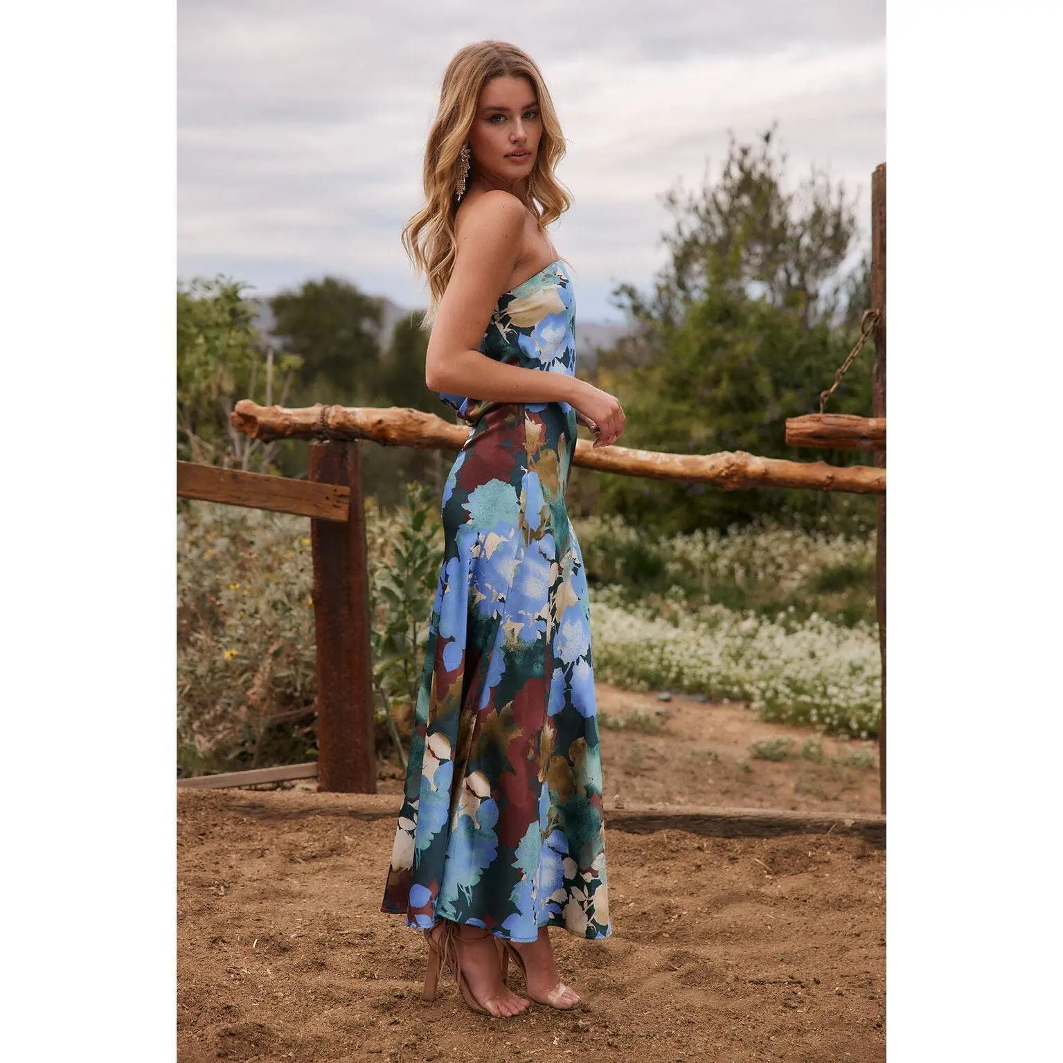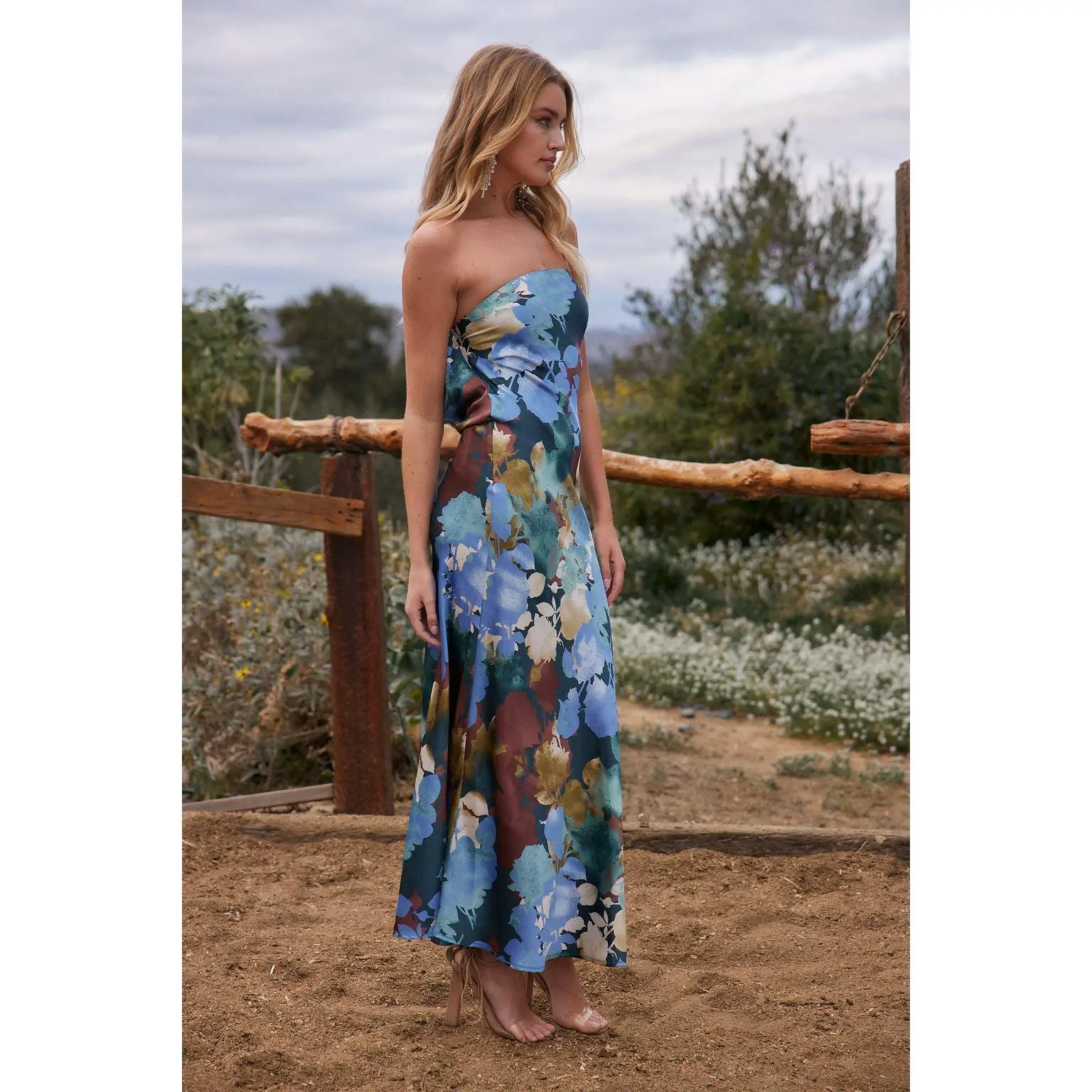 Natalia Blue Floral Printed Strapless Maxi Dress Elegant Cocktail