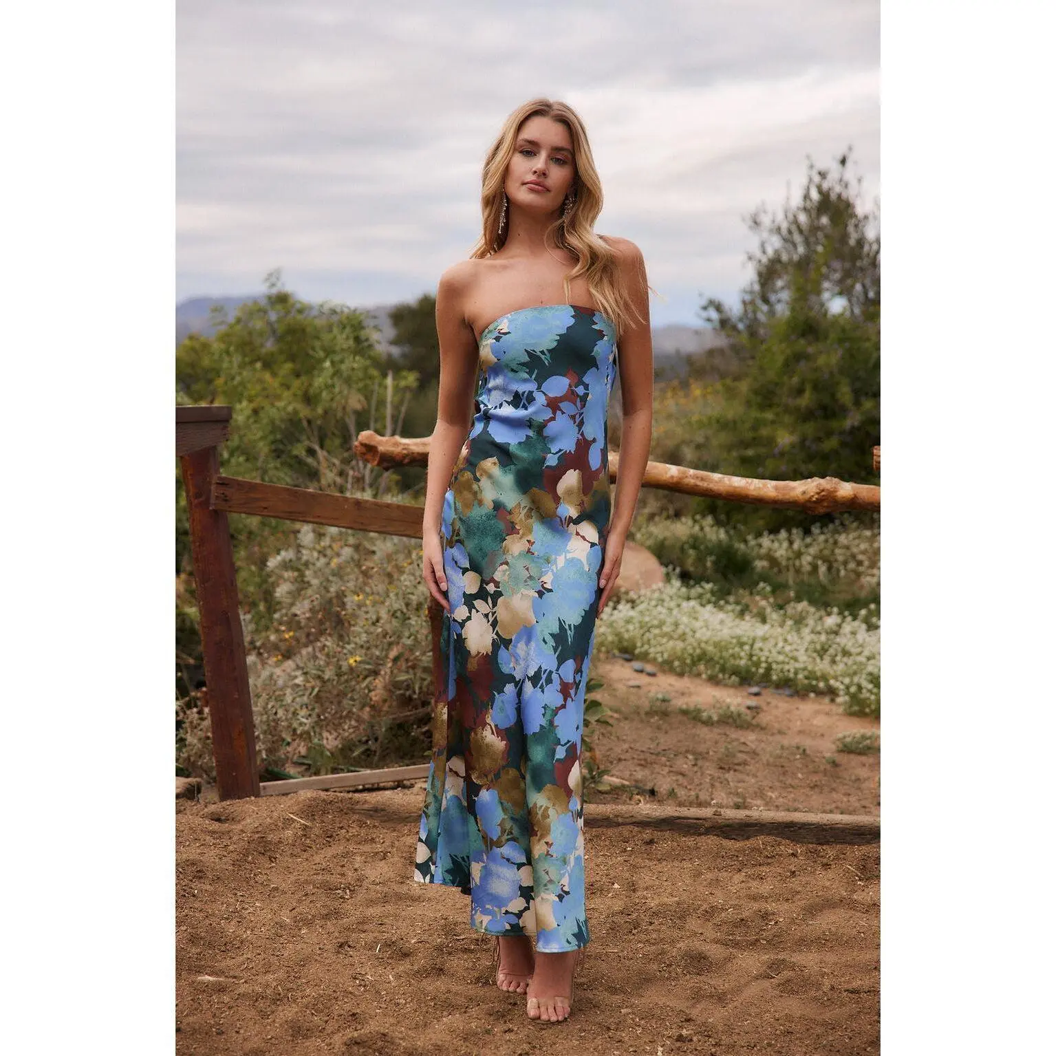 You all could not get enough of the Natalia Emerald Floral Strapless Maxi Dress, so we had to incorporate a new colorway. Now introducing the Natalia Blue Floral Printed Strapless Maxi Dress. There's no better dress to celebrate the newlyweds than in this strapless number; with its blue floral satin and an elegant silhouette, the Natalia is fitting from ceremony to cocktail hour and through the reception.STYLE RECOMMENDATIONS:- Complete the look with the Lyla Silver Flower Rhinestone Drop EarringsPRODUCT DESCRIPTION AND MATERIALS:- blue strapless floral maxi dress- elastic back with metal closure and cowl hem- unlined- 100% polyester- machine wash cold with like colors - only non chlorine bleach if needed- line dry- cool iron if needed- do not dry cleanSIZE RECOMMENDATIONS:- runs true to size- measured on a size smallExtra Small: 0-2- length: 48”Small: 2-4- length: 48.5”Medium: 6-8- length: 49" Large: 8-10- length: 49.5” Extra Large: 10-12- length: 50” MODEL DETAILS:- Josie is 5’9- Bust: 32 1/2 B- Waist: 25"- Wearing size Extra SmallRETURN POLICY:We offer refunds & exchanges within 15 days of delivery with tags attached & in original, unworn conditions (restrictions apply). We reserve the right to refuse returns & not honor refunds on items that have been worn, stained/soiled, laundered or altered in any way. This includes such marks as bodily fluids, deodorant stains & removed/tampered with liners. For sanitary reasons, we ask that you try on items over underwear. All sale items are final sale. Final sale items are non-returnable and non-exchange. Final sale items include: swim, jewelry, accessories, sale marked items, sale swim, and vintage garments.