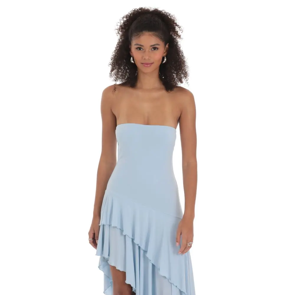 5. Strapless Ruffle Asymmetrical Maxi Dress in Blue