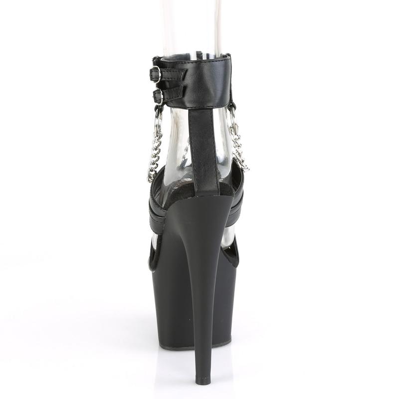 Rock the stage with the Pleaser Adore-761 Black Faux Leather Strappy Sandal, a fierce pick for exotic dancers. These black faux leather 7-inch heel strappy sandals feature metal rings and chains for an edgy vibe.