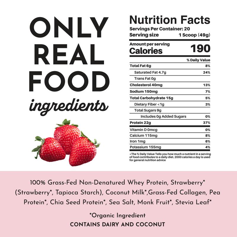 IngredientsStevia Leaf,Monk Fruit,Sea Salt,Chia Seeds,Pea Protein,Grass-Fed Collagen,Coconut Milk,Strawberry* • Tapioca Starch,Strawberry,100% Grass-Fed Non-Denatured Whey Protein
