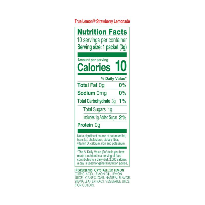 Love this strawberry lemonade! Low calories, easy to mix single packet size. Great for flavoring a single water bottle. Will definitely buy more on the next order.
