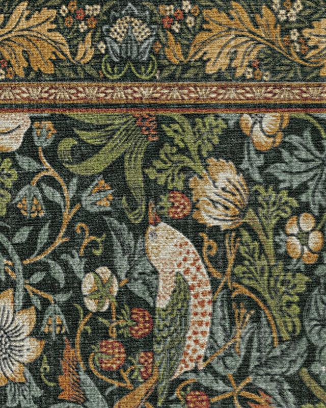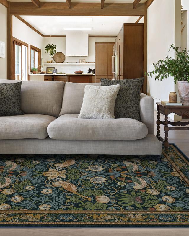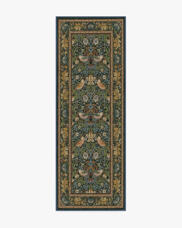 Step into Kelmscott Manor's garden with the Morris & Co. Strawberry Thief Indigo Rug. A direct translation of William Morris's recognizable block print textile, this rug depicts Morris's thrushes stealing fruit from his kitchen garden. A nod to the original design, this colorway contrasts deep indigo with fresh reds, mossy greens, and golden highlights, leaving a grand impact. Water-resistant, stain-resistant, and machine-washable. Rug colors may vary slightly according to your device and the lighting in your space.
