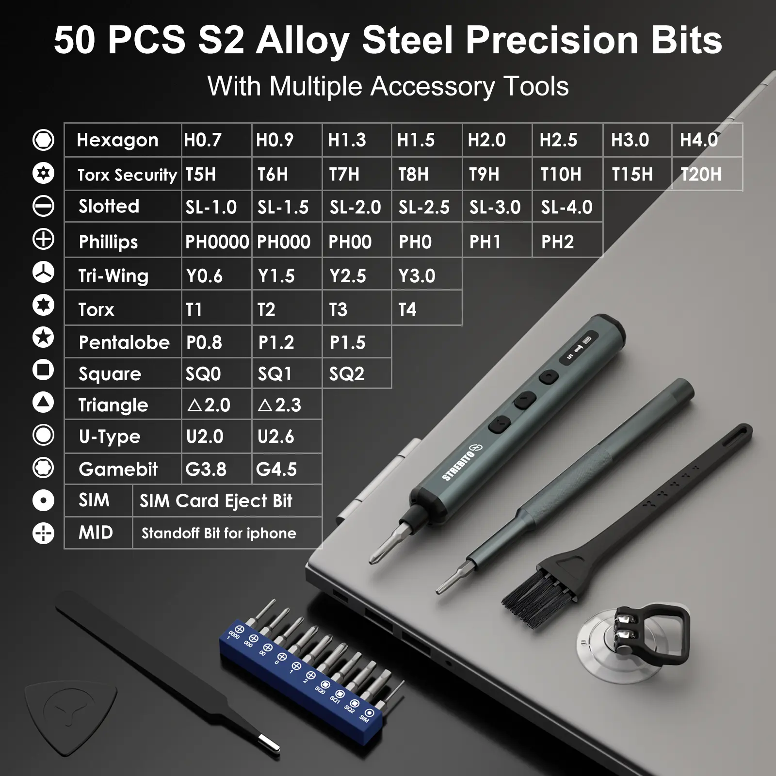 ·【Comprehensive 50-Bit Set & Tools】This electric screwdriver set includes 50 precision S2 bits covering Phillips, Torx, Torx Security, Slotted, Hex, Tri-Wing, Pentalobe, Triangle, SQ, U-Type, G-Type, MID, and SIM pin, plus a built-in magnetizer, tweezers for micro components, pry tools, hook tool, suction cup, and cleaning brush, ensuring all common electronic repair needs are met in one complete, portable kit