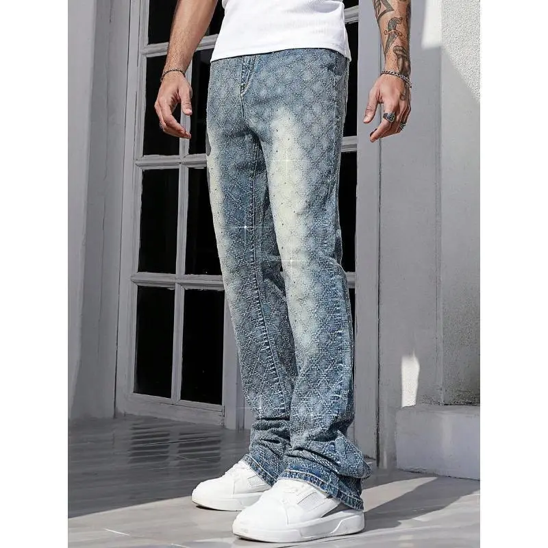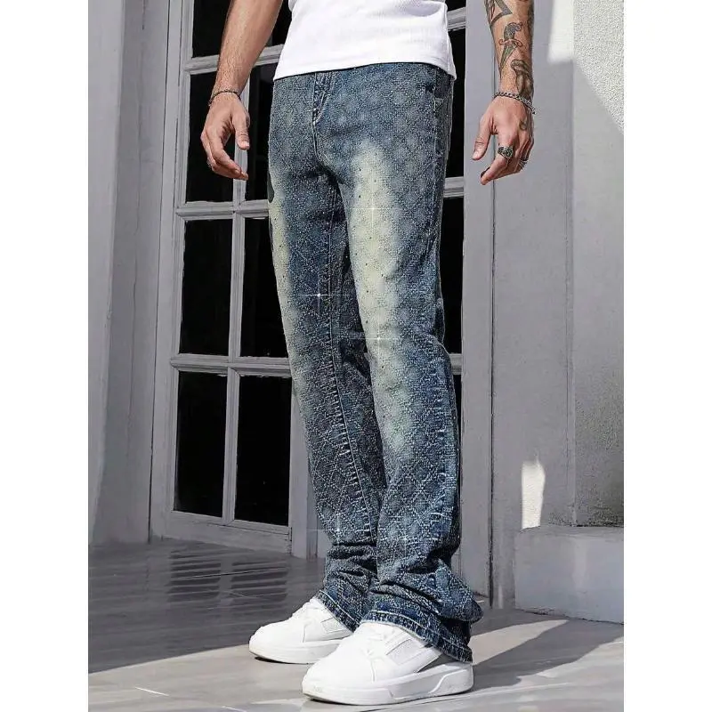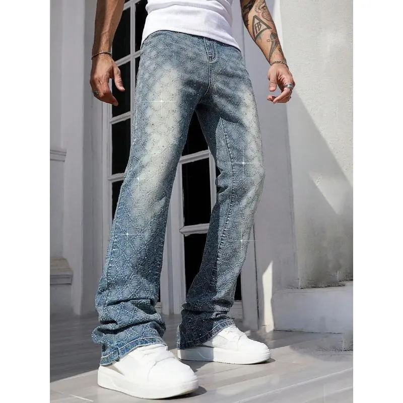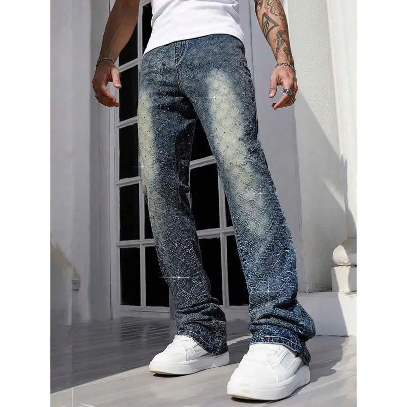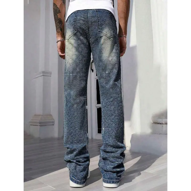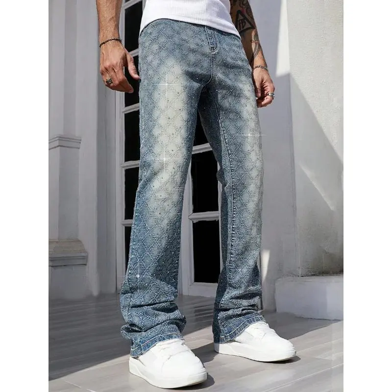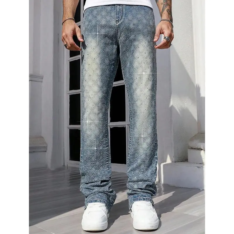 StreetLifeMen'sCasualDistressedWashRhinestoneDecorDenimJeansFabricMenswear