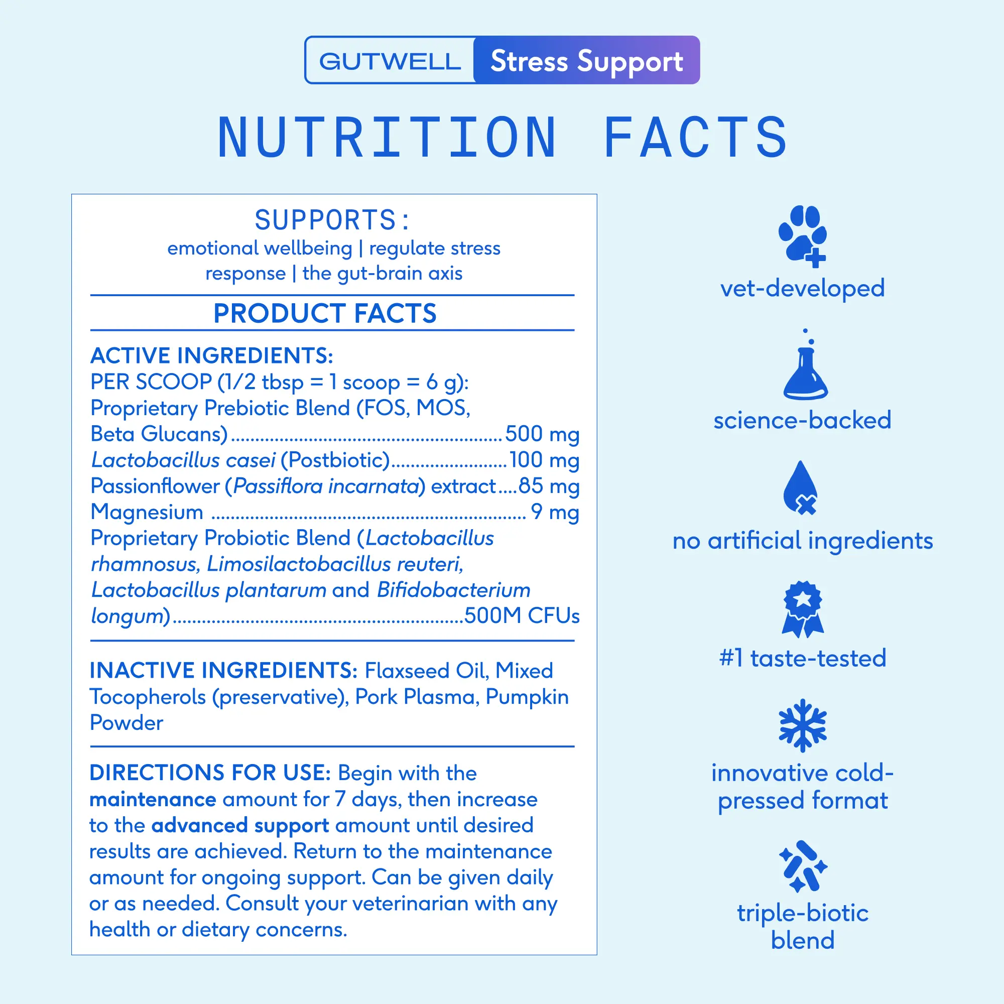 Our son recommended we try the GutWell Stress Support as our dog tends to be anxious and was starting to chew on her paws. She immediately loved it and as soon as we wake up so now runs to her bowl and sits there waiting for it! After about a week we started to see a difference. She chews a lot less on her paws and just seems to be all around happier!