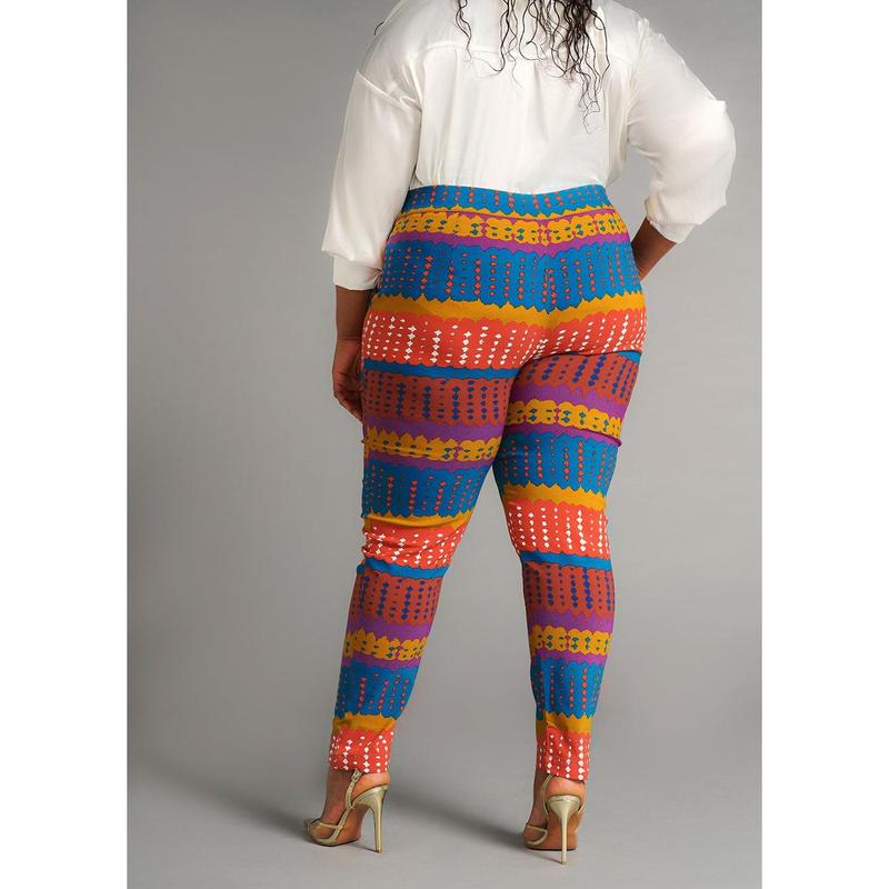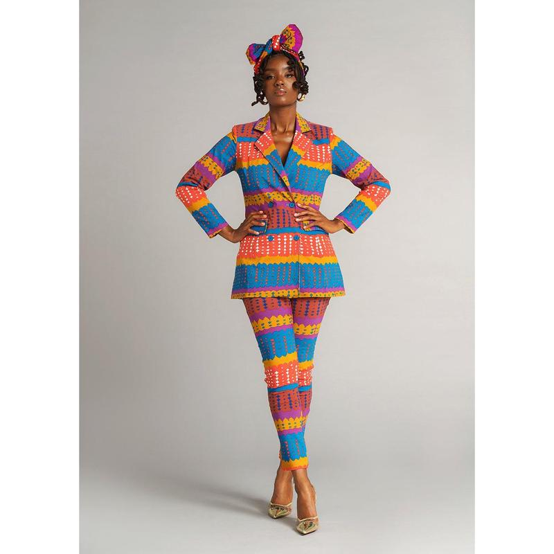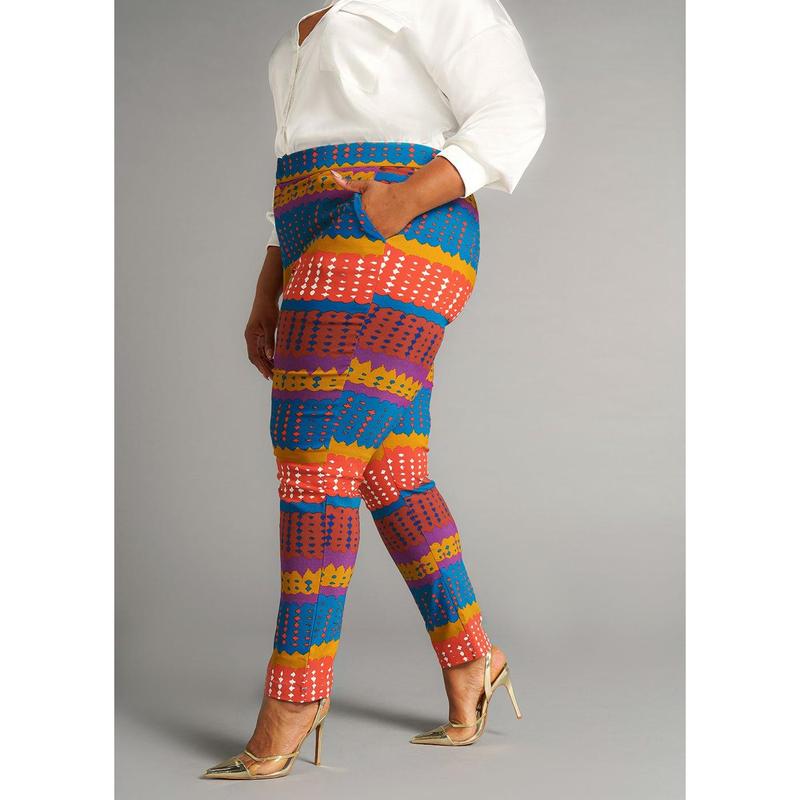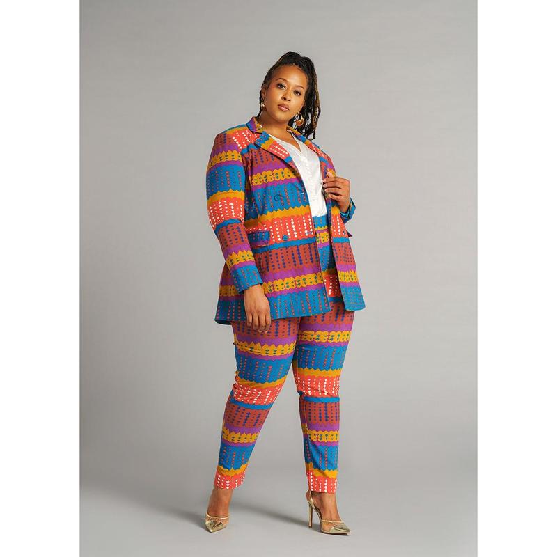 Our Talia African Print Stretch Pants are designed for the modern individual who values both flexibility and fashion. Meaning 'to bloom' in Arabic, these flattering skinny pants adapts to your lifestyle, providing the flexibility that you need without compromising on fashion. Wear with your favorite pair of boots, heels, or sneakers and pair with our Uyai stretch blazer.