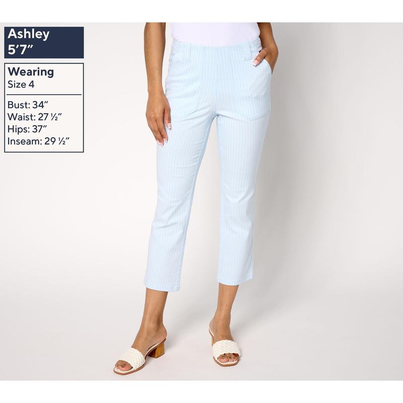 Belle by Kim Gravel Regular Harbor Island Stretch Pinstripe Pant. Pull on Woven with pork chop pockets with belt loops. Straight leg. Semi-Fitted, follows the lines of the body with added wearing ease. Regular Inseam: 25". Content: 75% Rayon, 21% Nylon, 4% Spandex. Care: MWCDC/TGIO/WS/ONCBWN/HTD/CIIN. Imported. Rise slightly set below waist, straight leg shape .
