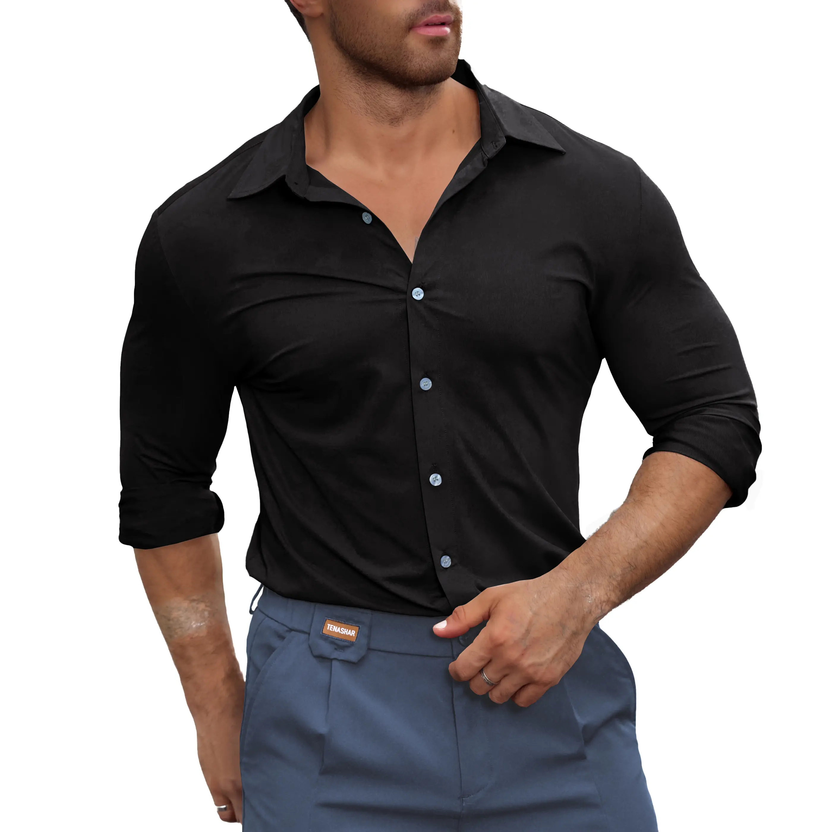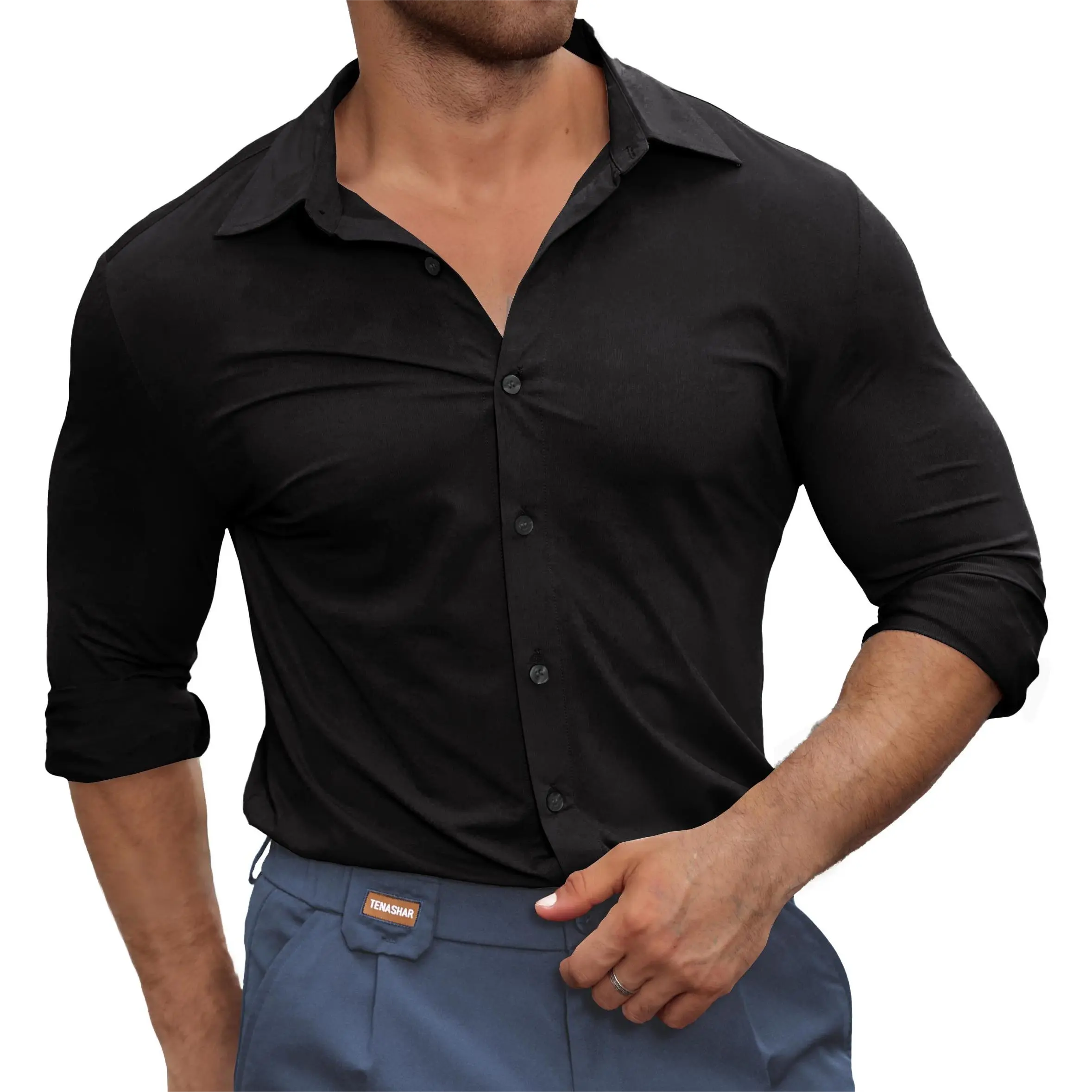 Made with stretch fabric blended with 20% spandex, this shirt resists wrinkles.Crafted for the modern man who values both performance and style, whether youâre at the office, a casual outing, or a special event, this shirt is engineered to keep you looking sharp and feeling confident.