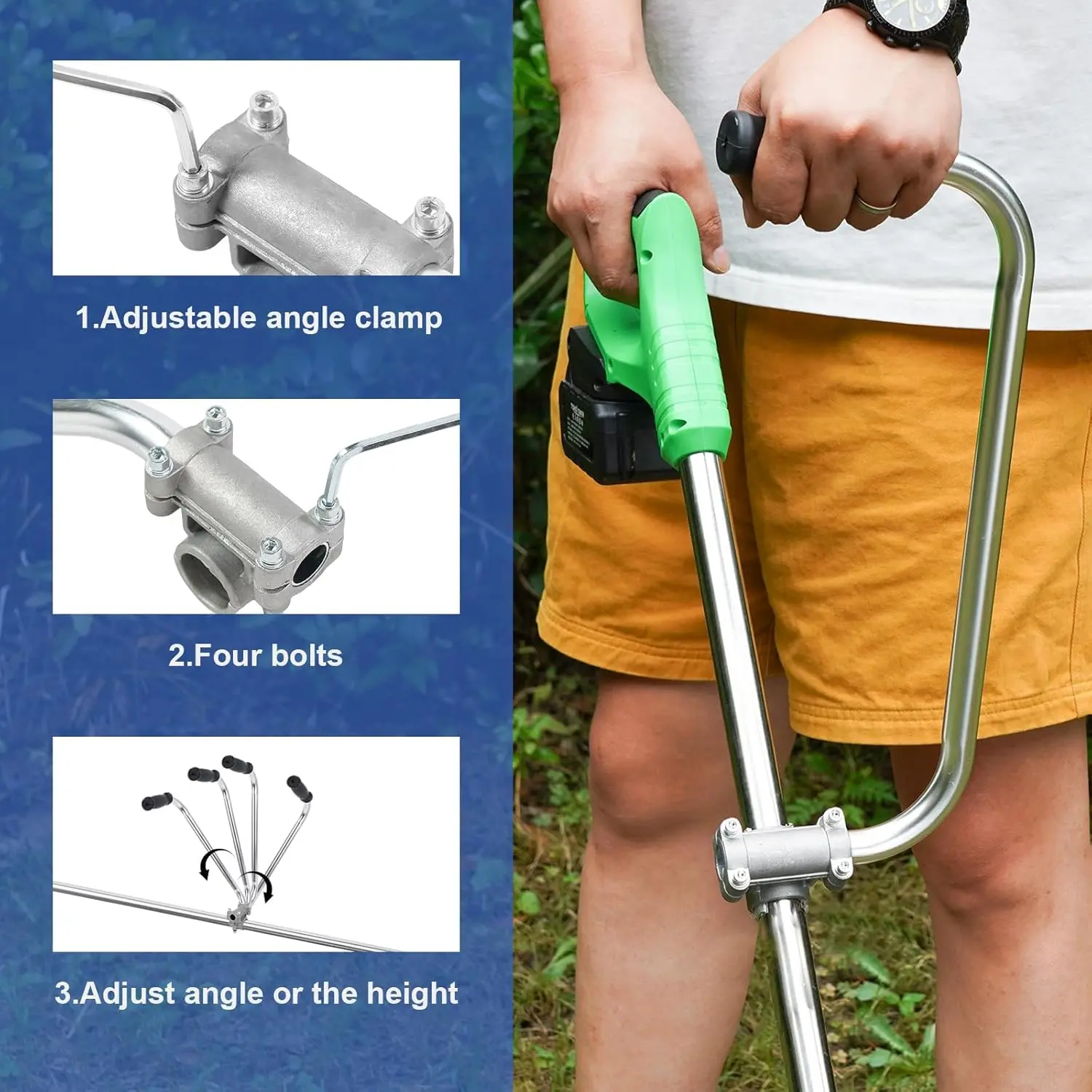 Easy to Install and Use: Our Weed Eater Handle is straightforward to install on your trimmer shaft.Just remove the four and vise bottom with a hex wrench, attach the vise to the trimmer shaft, tighten the vise to where you need it, adjust the built-in clamp, and lock it in place.You can also adjust the angle of the handle as needed to the trimmer handle and ensure you can stand up straight.