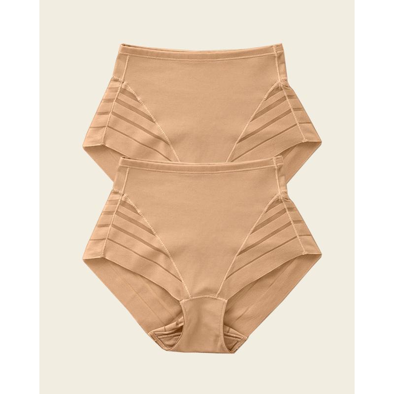 This panties give a bit of belly compression, the crotch area is wider than the usual but are confortable. The only thing is that the black one is smaller than the beige one, in a package of the same size. Some lines are visible too.