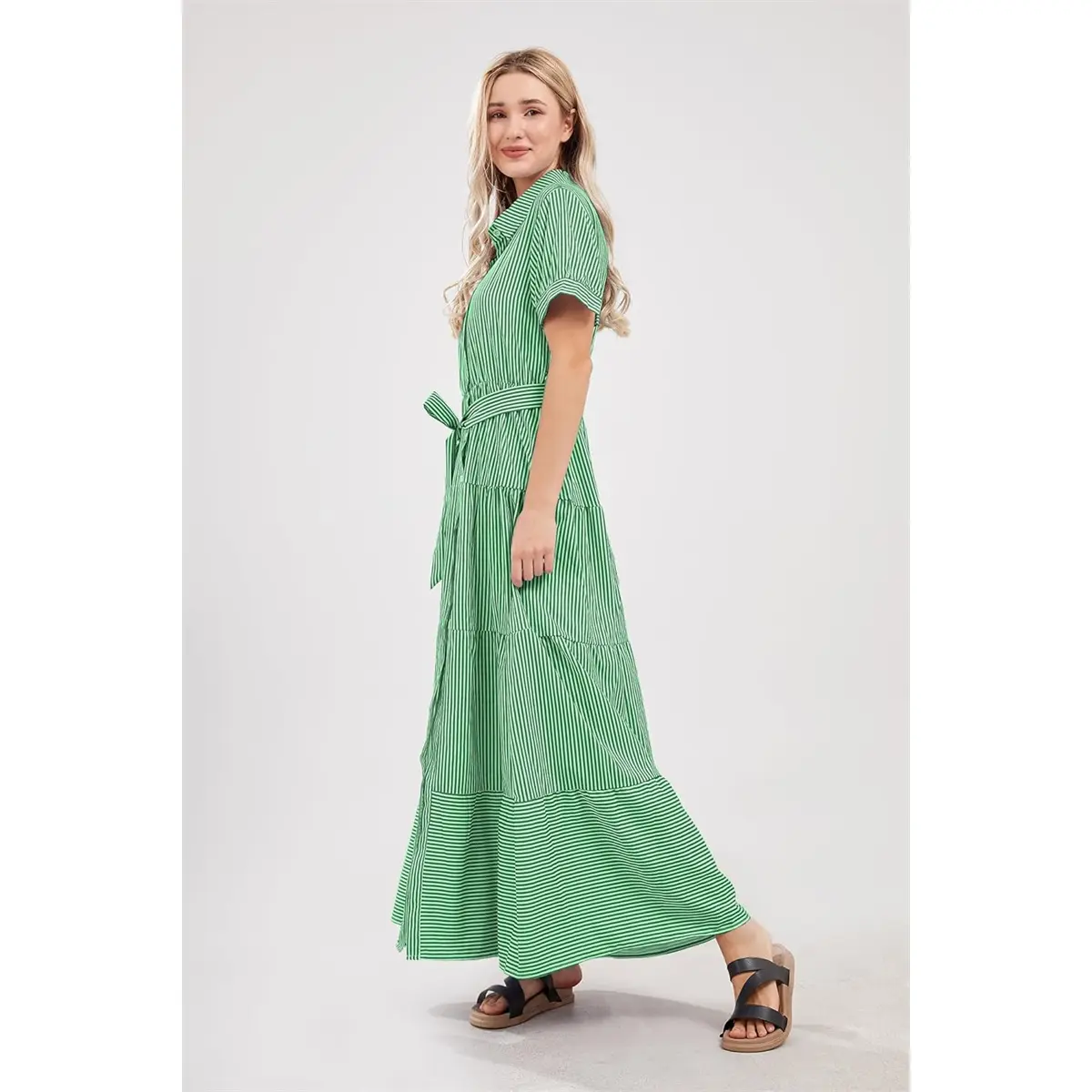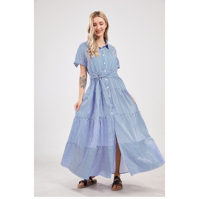 ·Flowy tiered striped maxi shirt dress with a belt, polo collar, short sleeves, high waist, a-line silhouette, and layered ruffle hemline.