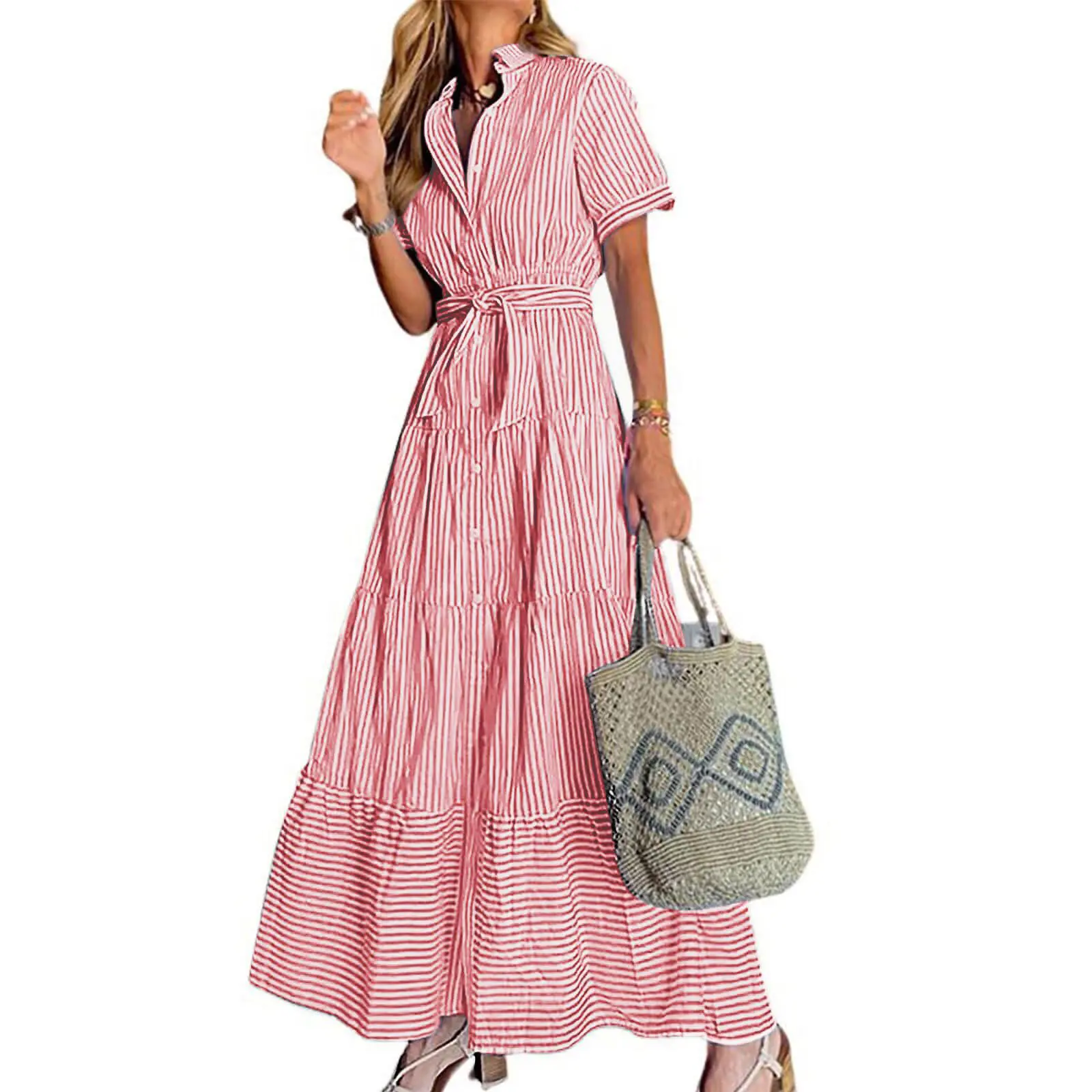 utcoco Women's Summer Striped Dress with Tie Waist Ruffles Long Casual Shortsleeve Womenswear Shirt Dress