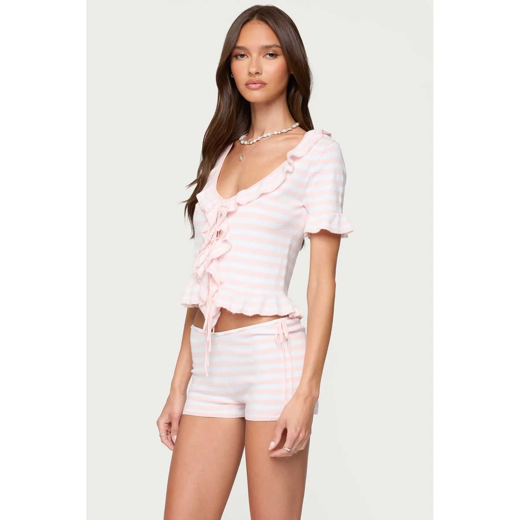 This top is so cute! I am going to have to find the perfect thing to wear under it and with it. Those shorts might be in my near future. Very high quality product. Anything pink the pink rn is buying it and I will be wearing it in my lives.