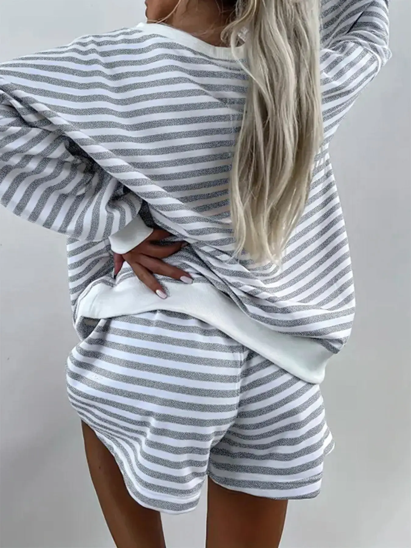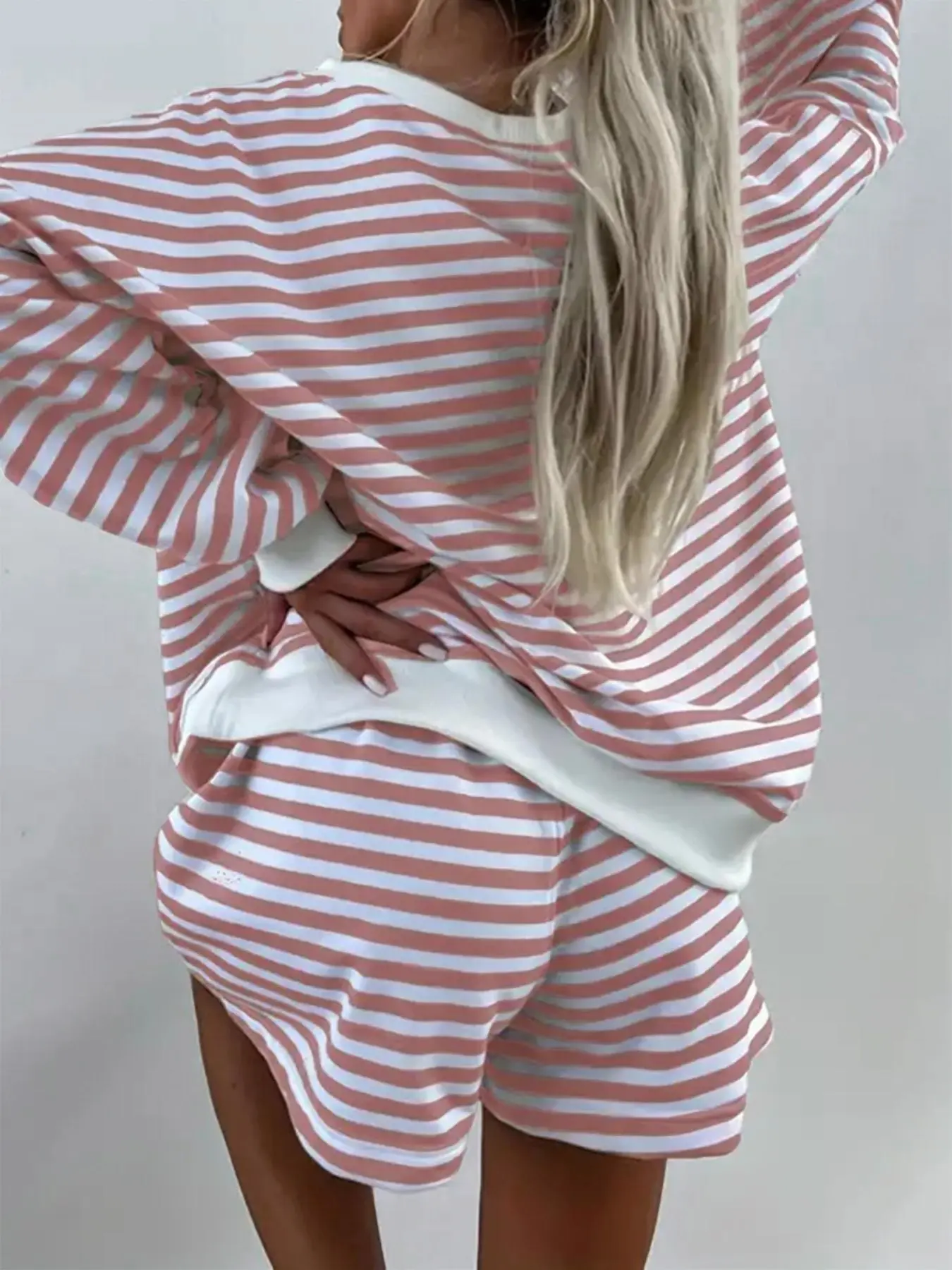 Just as shown in the photo! Feels good , a French terry type weave on the inside over size top. Shorts are fine. Well made. Good stitching