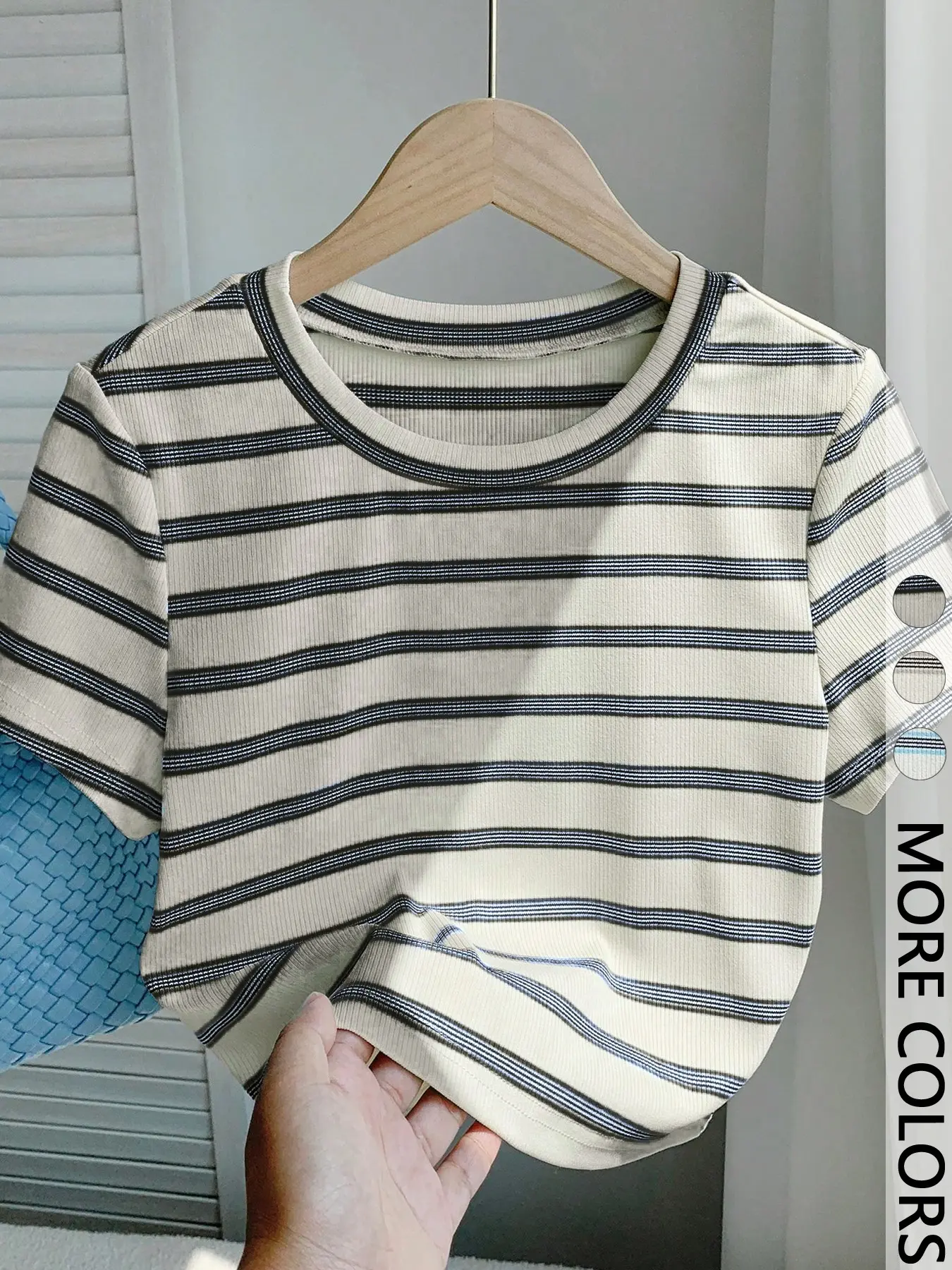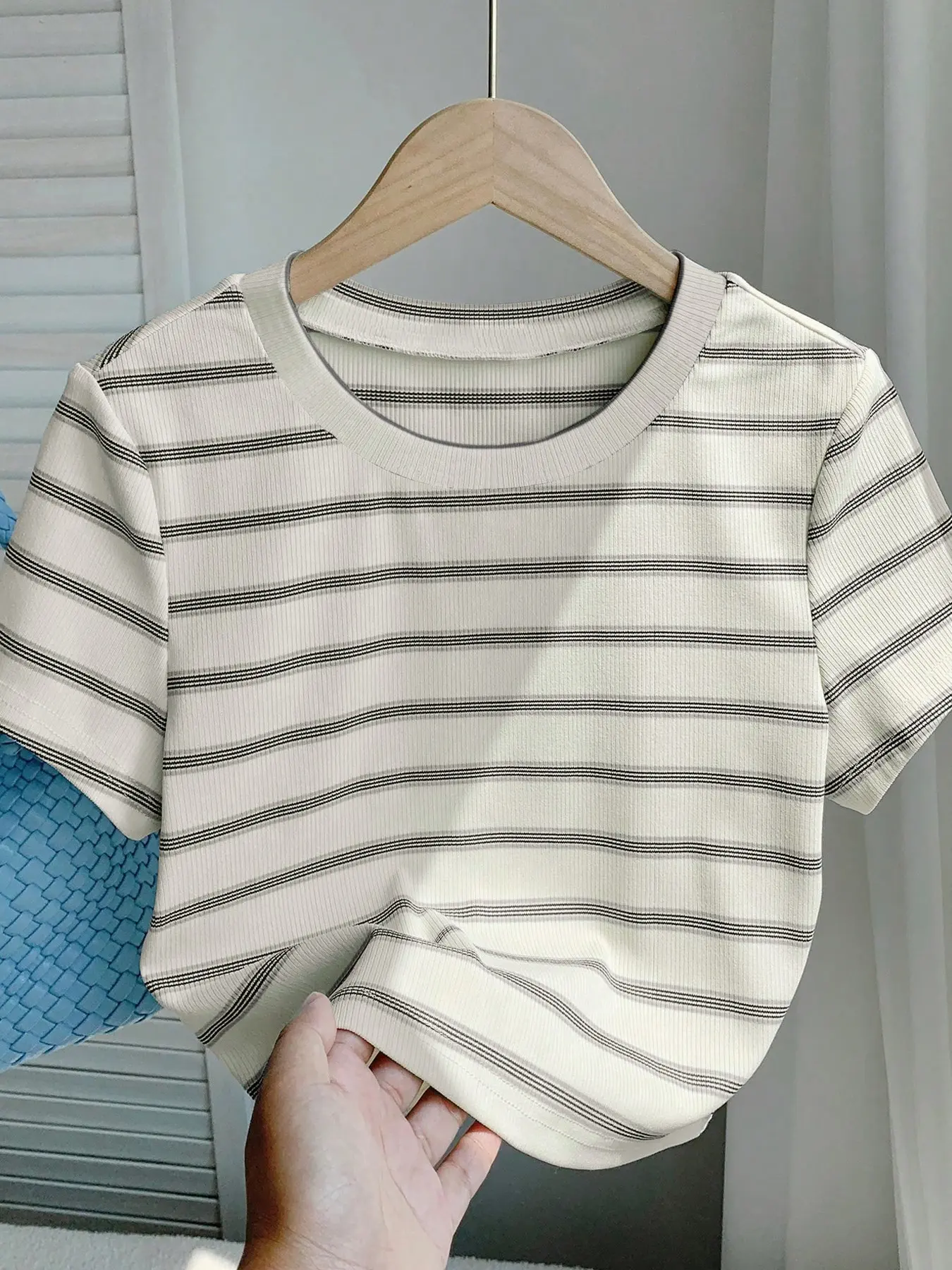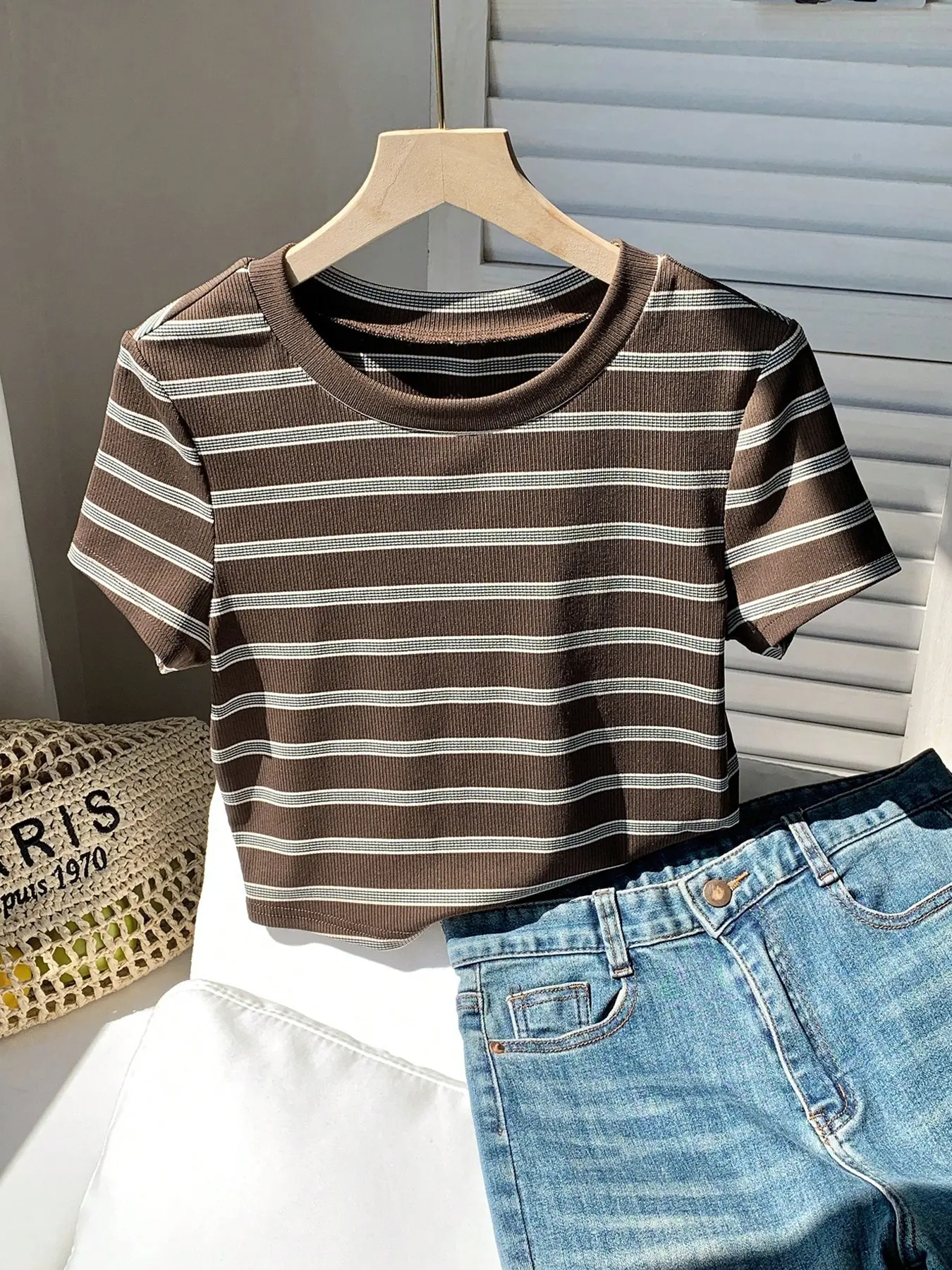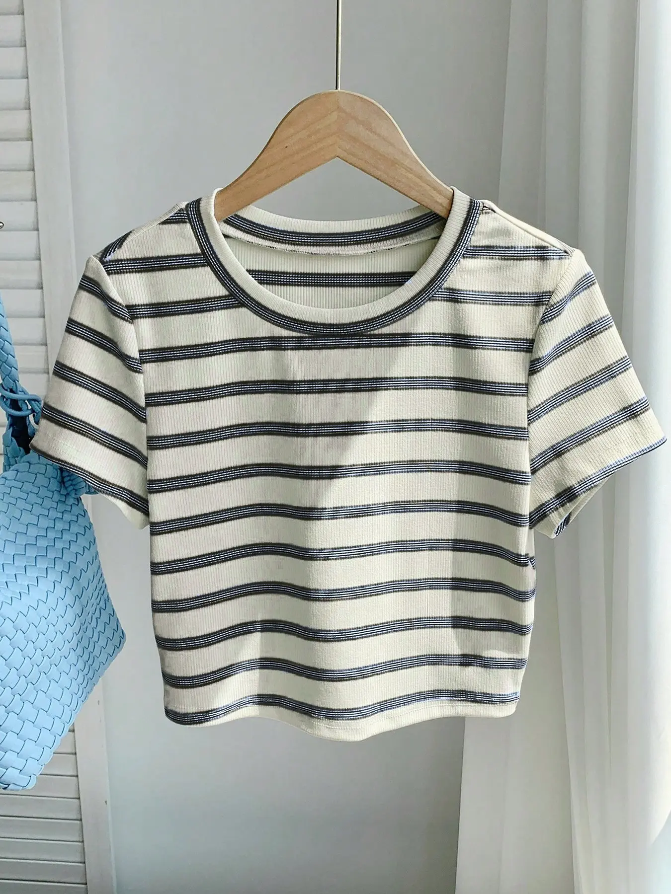 1 Piece Striped Slim Fitted Cropped Top | Sweet Cool  Aesthetic | Crew Neck Short Sleeve + Stretchy Ribbed Design | Perfect for Girls' Shopping Spree / Café Photo Ops